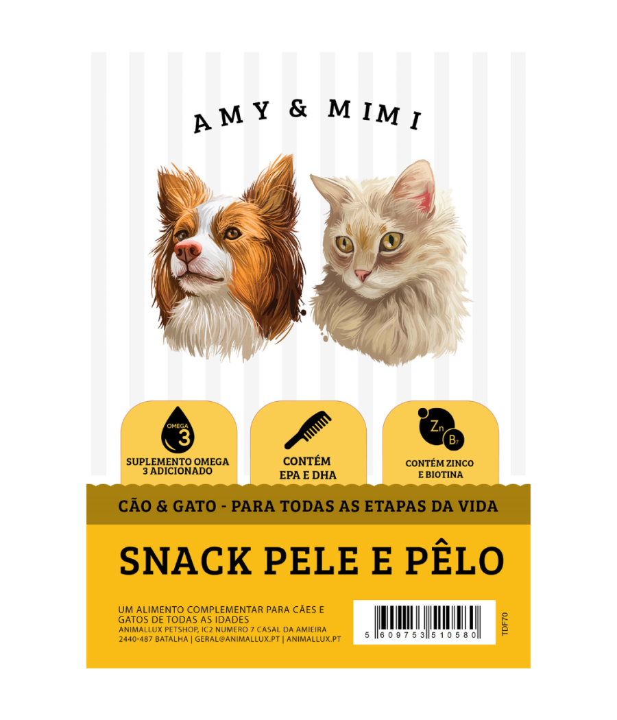 As preocupações com a saúde, nutrição e bem-estar são vistas como motivadores principais, com cada vez mais donos de animais a voltarem-se para snacks funcionais para ajudar a proteger a saúde dos seus animais de estimação. Desenvolvemos a linha de Snacks Funcionais Amy & Mimi com receitas exclusivas criadas para fornecer vários benefícios funcionais, além disso esta linha de snacks oferece uma maneira nutritiva e saudável de recompensar os animais de estimação.