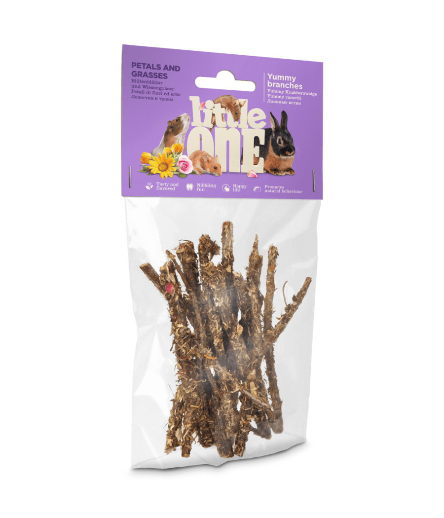 Os Yummy Branches da Little One são ramos com pétalas e ervas para roedores que, além de serem um snack delicioso, promovem a saúde dos dentes destes animais. Fonte de vitaminas e minerais, para o bem-estar geral dos roedores.
