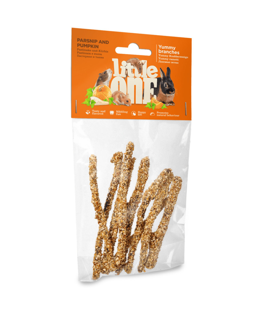 Os Yummy Branches da Little One são ramos com pastinaca e abóbora para roedores que, além de serem um snack delicioso, promovem a saúde dos dentes destes animais. Fonte de vitaminas e minerais, para o bem-estar geral dos roedores.