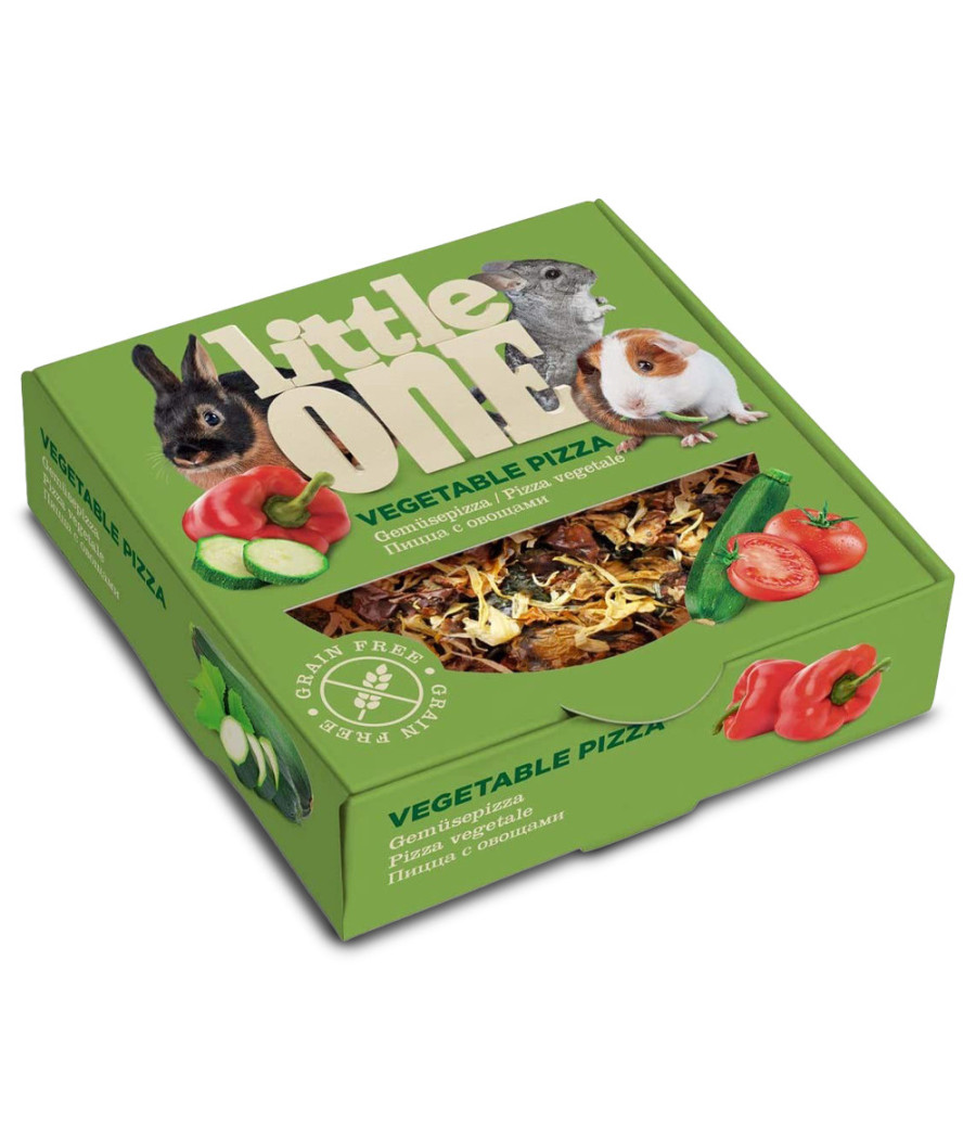 Little One Vegetable Pizza é um snack para roedores, delicioso e saudável. A cobertura contém curgete seca, tomate e pimenta vermelha, com pétalas aromáticas da flor margarida. Um snack que é uma fonte de vitaminas e outros nutrientes, essenciais ao bem-estar do seu pequeno roedor. O formato em pizza é ideal para ele morder, ajudando à saúde dos dentes.