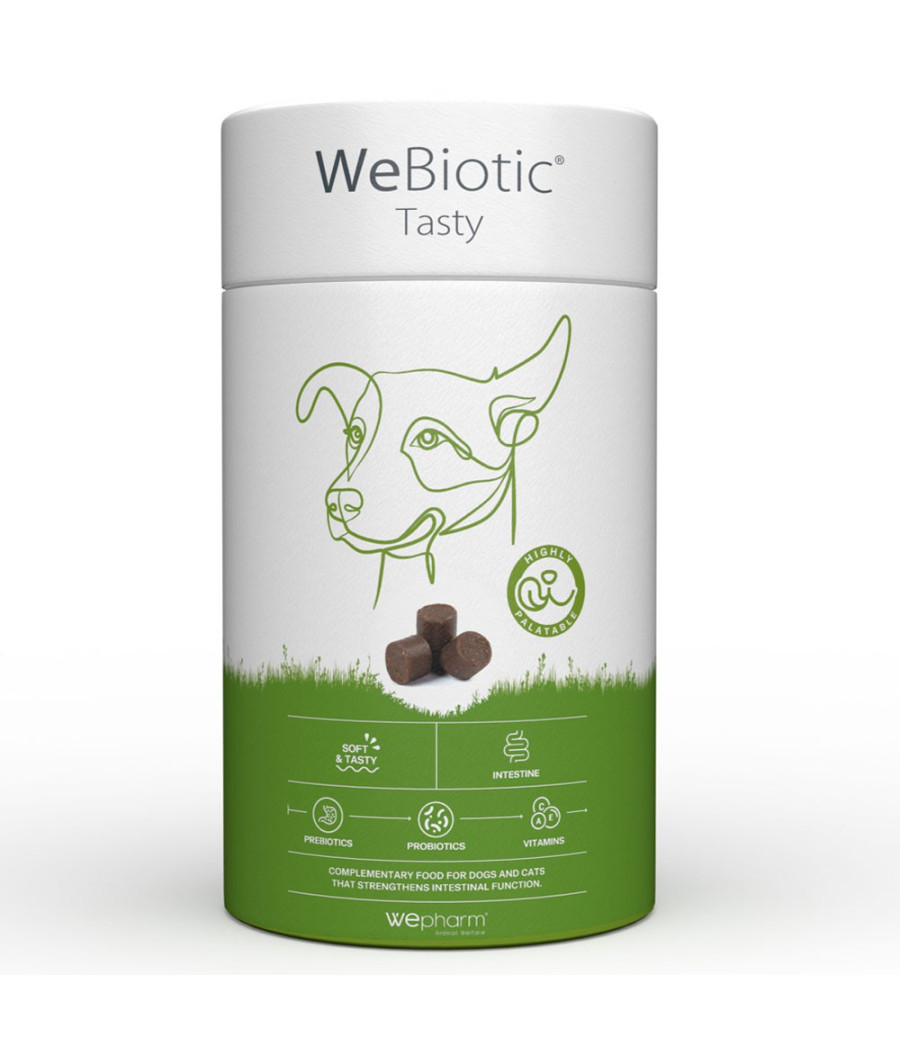 WeBiotic Tasty da Wepharm: Suplemento palatável para cães e gatos, com probióticos e prebióticos que promovem o equilíbrio da flora intestinal e o bem-estar digestivo.