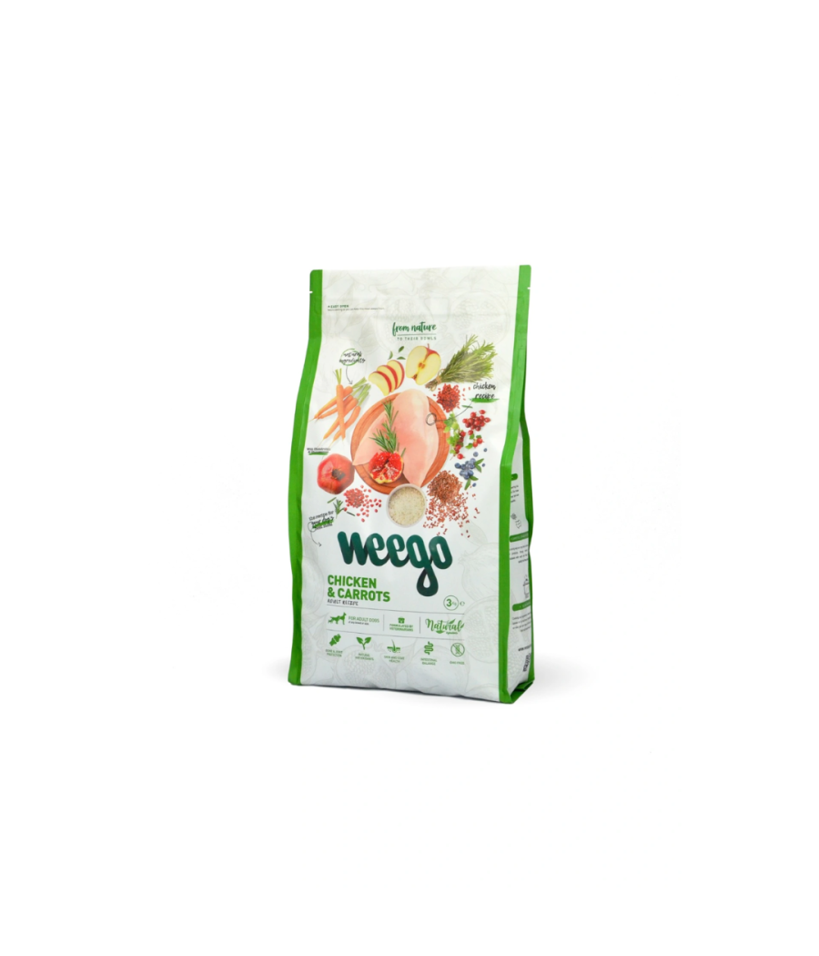 Alimento seco, natural, completo e equilibrado à base de frango e adequado para cães adultos de qualquer raça ou tamanho.