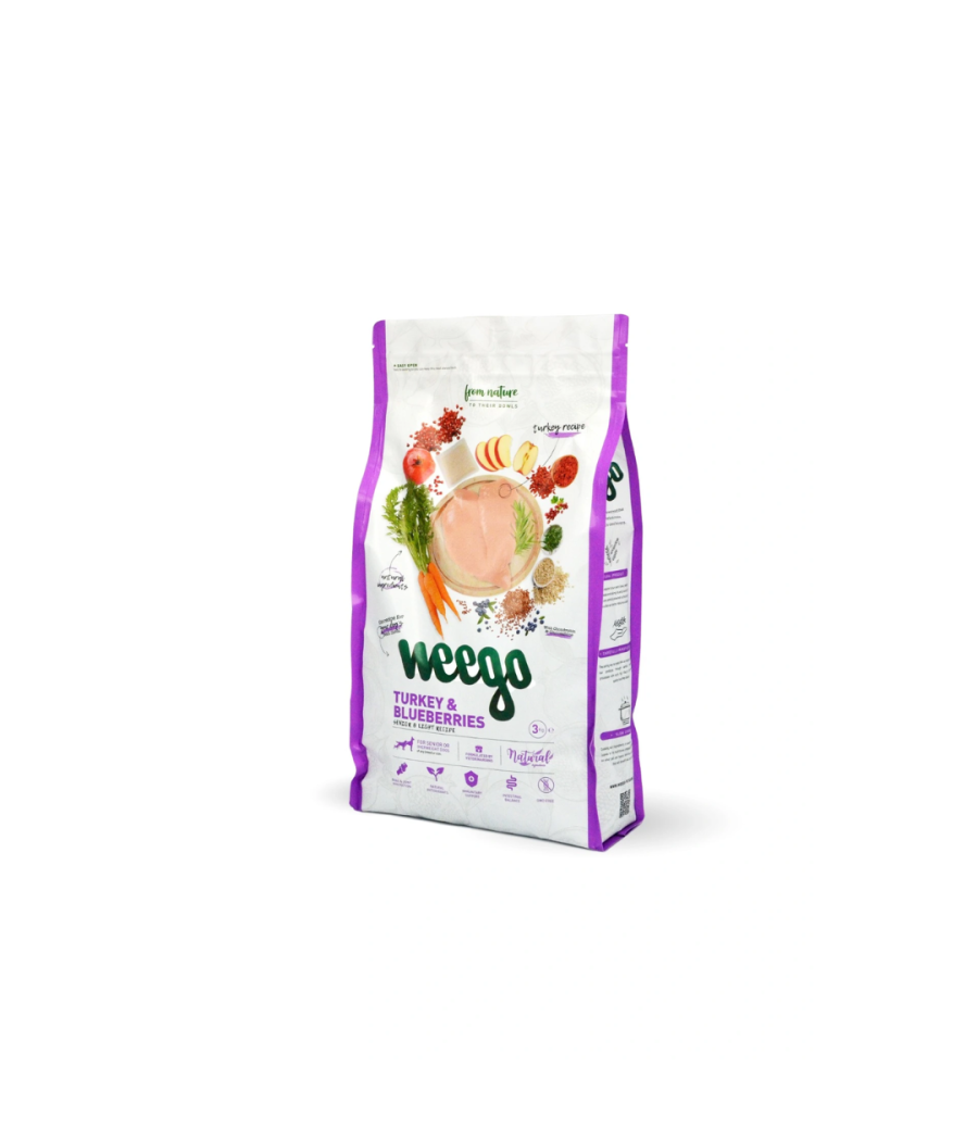 Alimento seco, natural, completo e equilibrado à base de peru e adequado para cães com mais de 7 anos ou excesso de peso, de qualquer raça ou tamanho.
