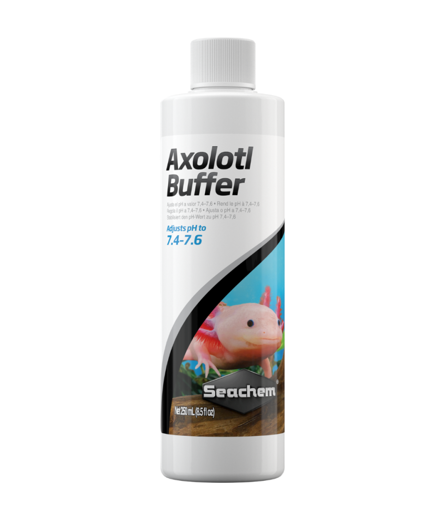 O pH ideal da água para axolotes é de 7,4 a 7,6. O Seachem Axolotl Buffer™ ajusta o pH para 7,4–7,6, podendo ser baixo ou alto.