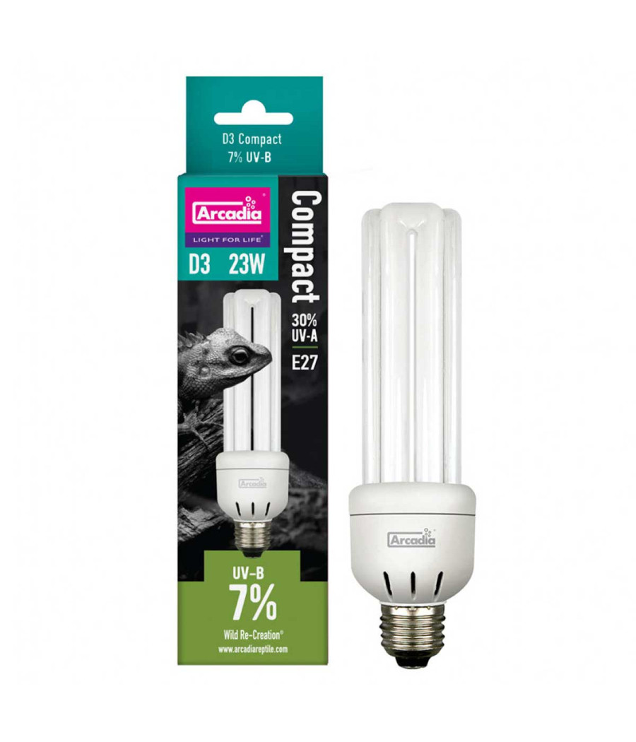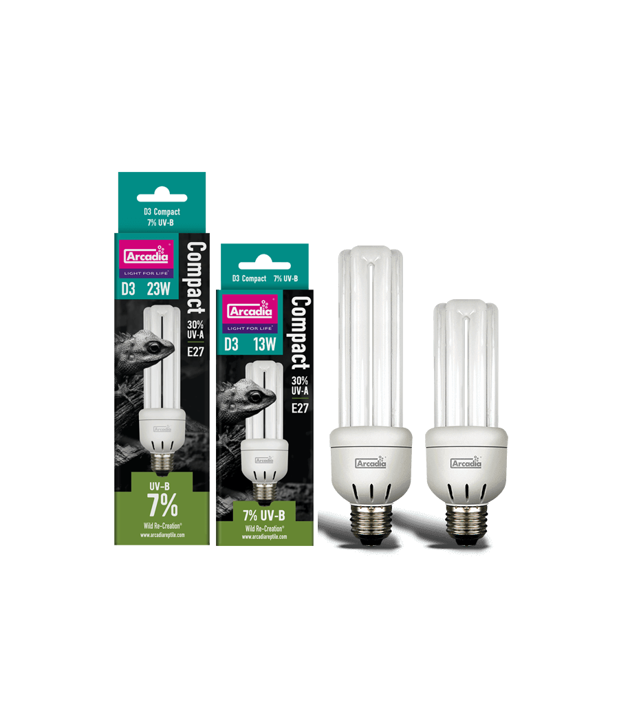 As lâmpadas Arcadia D3 Compact + UVB são a maneira perfeita de garantir que o seu réptil recebe todos os raios UVA e UVB necessários para a absorção correta da vitamina D3.