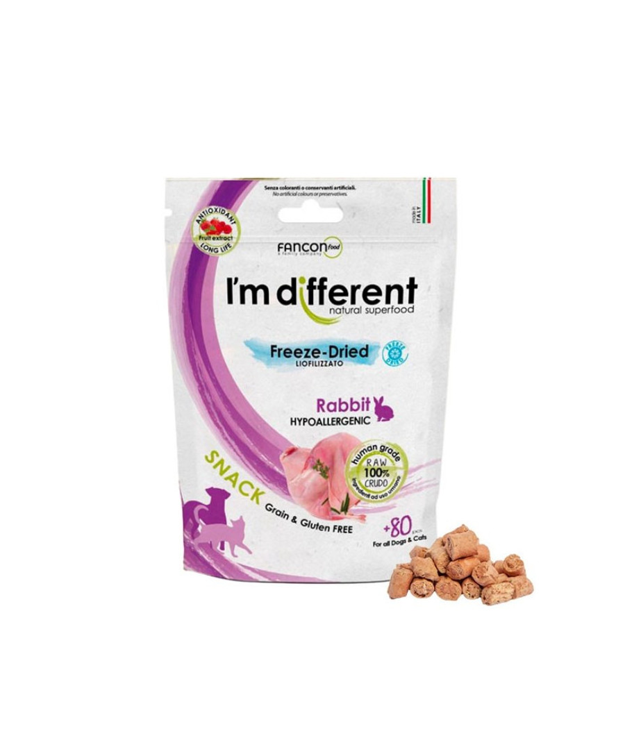 Os snacks liofilizados para coelho I'm different liofilizados são feitos com proteínas totalmente naturais de alta qualidade, mais de 90% de carne de coelho crua e fresca, de qualidade humana, cuidadosamente liofilizada para preservar todo o seu sabor e nutrientes naturais.