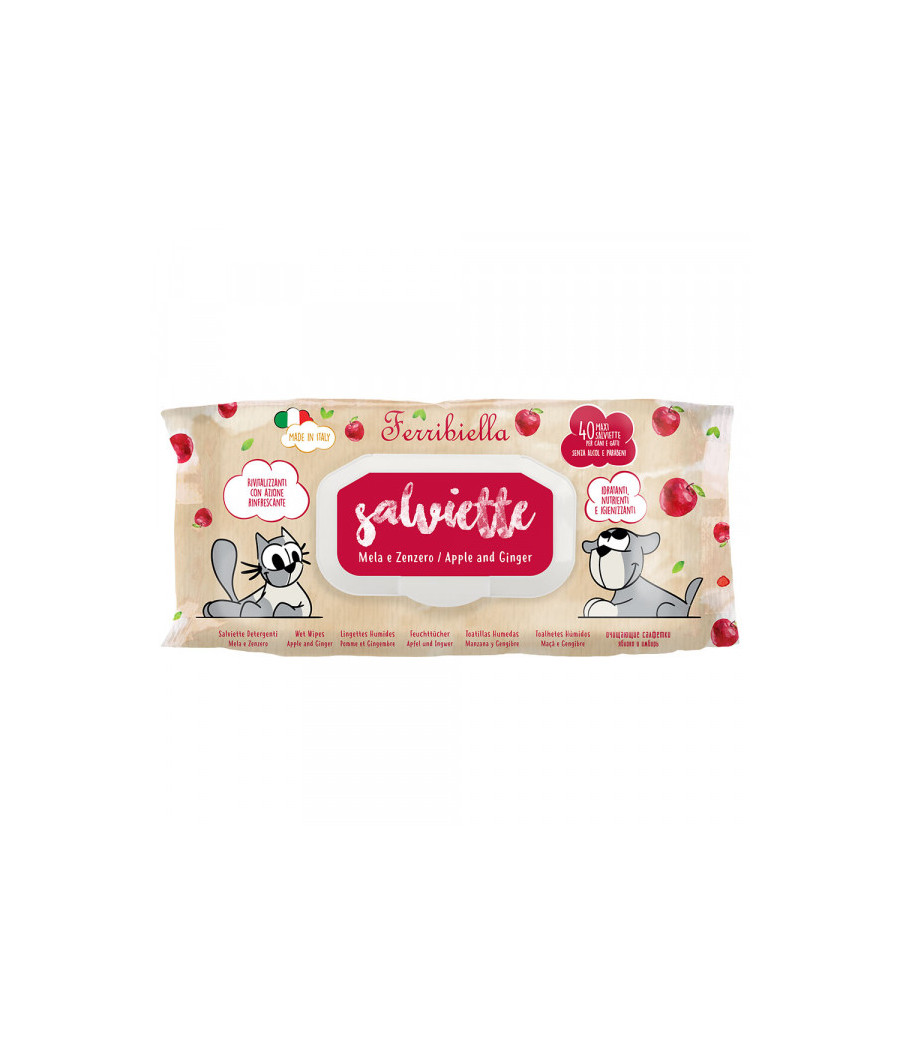As Toalhitas Húmidas Salviette com Cheiro a Maçã e Gengibre são perfeitas para a higiene diária de cães e gatos, proporcionando uma limpeza suave e eficaz, com um suave perfume. Os componentes destas toalhitas garantem hidratação, frescura e conforto, sem causar irritações na pele. Ideais para remover sujidade, deixam o pelo sedoso e a pele macia, oferecendo uma sensação de limpeza e frescura imediatas.
