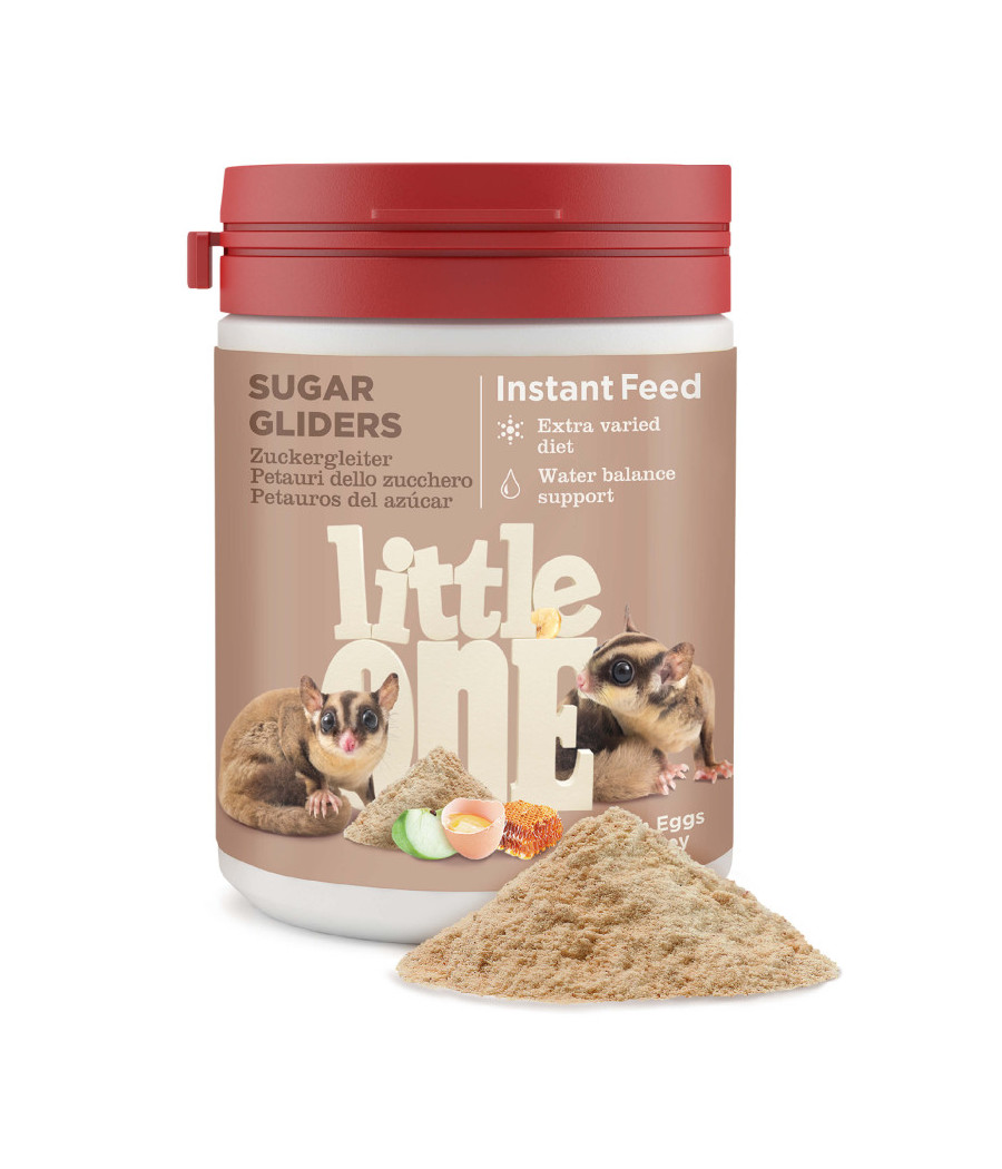 O alimento instantâneo Little One para petauros-do-açúcar foi desenvolvido com base na alimentação natural do seu habitat natural. Proporciona uma dieta equilibrada, variada e altamente palatável.