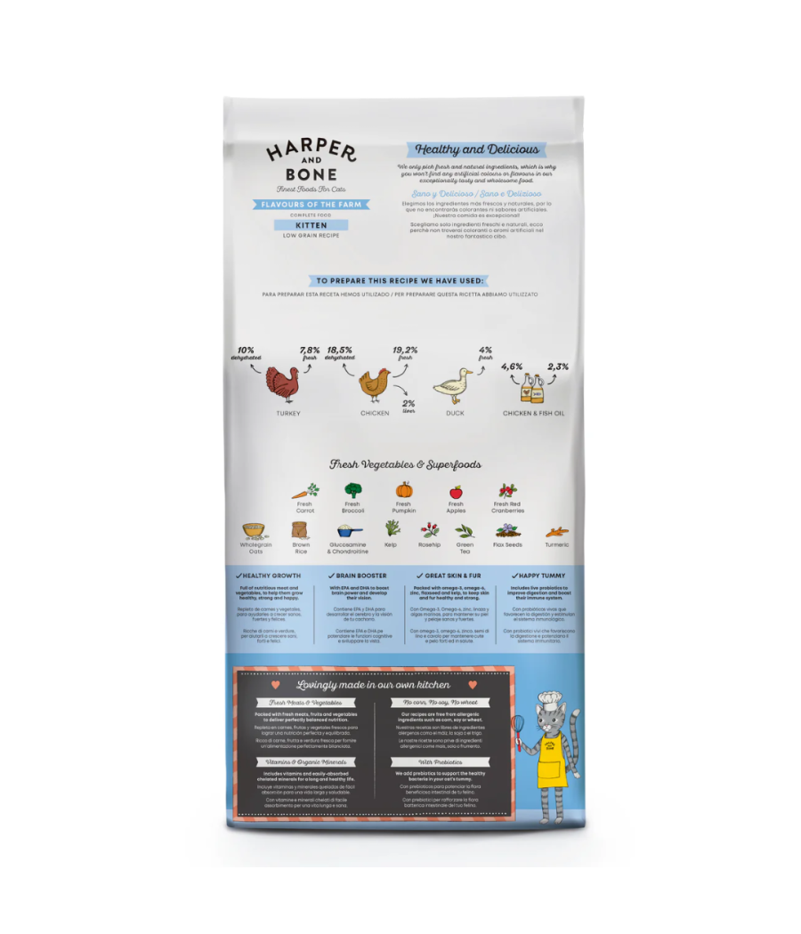 A Ração Gatinho Kitten Flavours Farm Harper & Bone foi especialmente desenvolvida para responder às necessidades nutricionais dos gatinhos em fase de crescimento. Com uma fórmula equilibrada, rica em proteínas de alta qualidade, vitaminas e minerais, esta ração garante um desenvolvimento saudável, fortalecendo músculos, ossos e sistema imunitário.