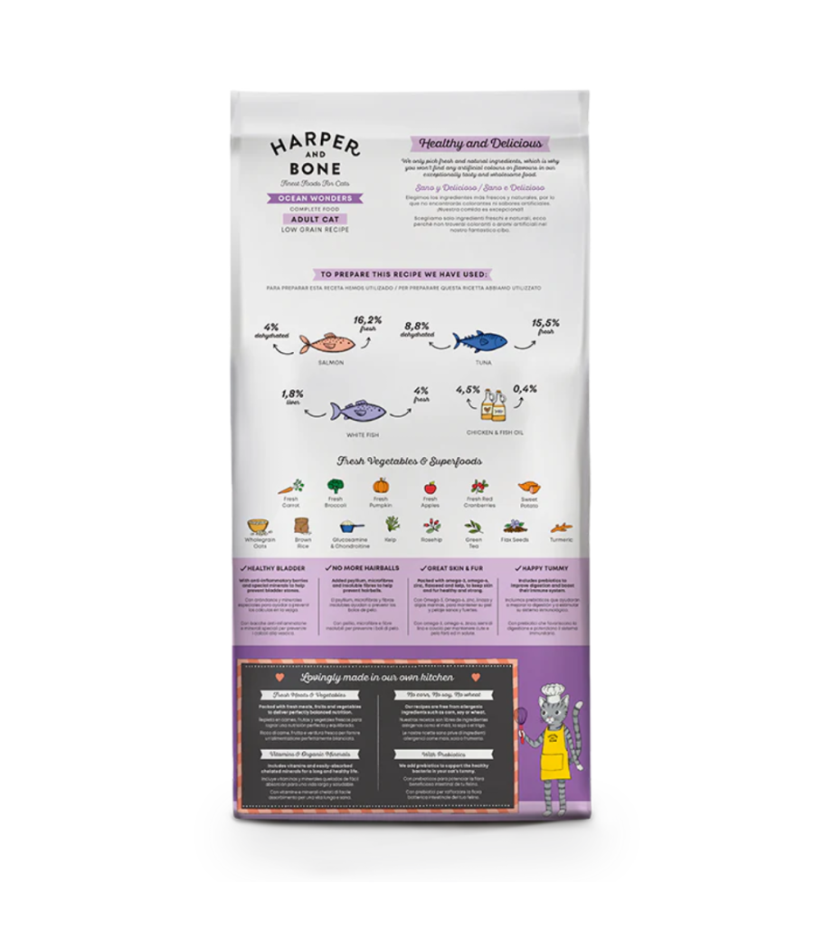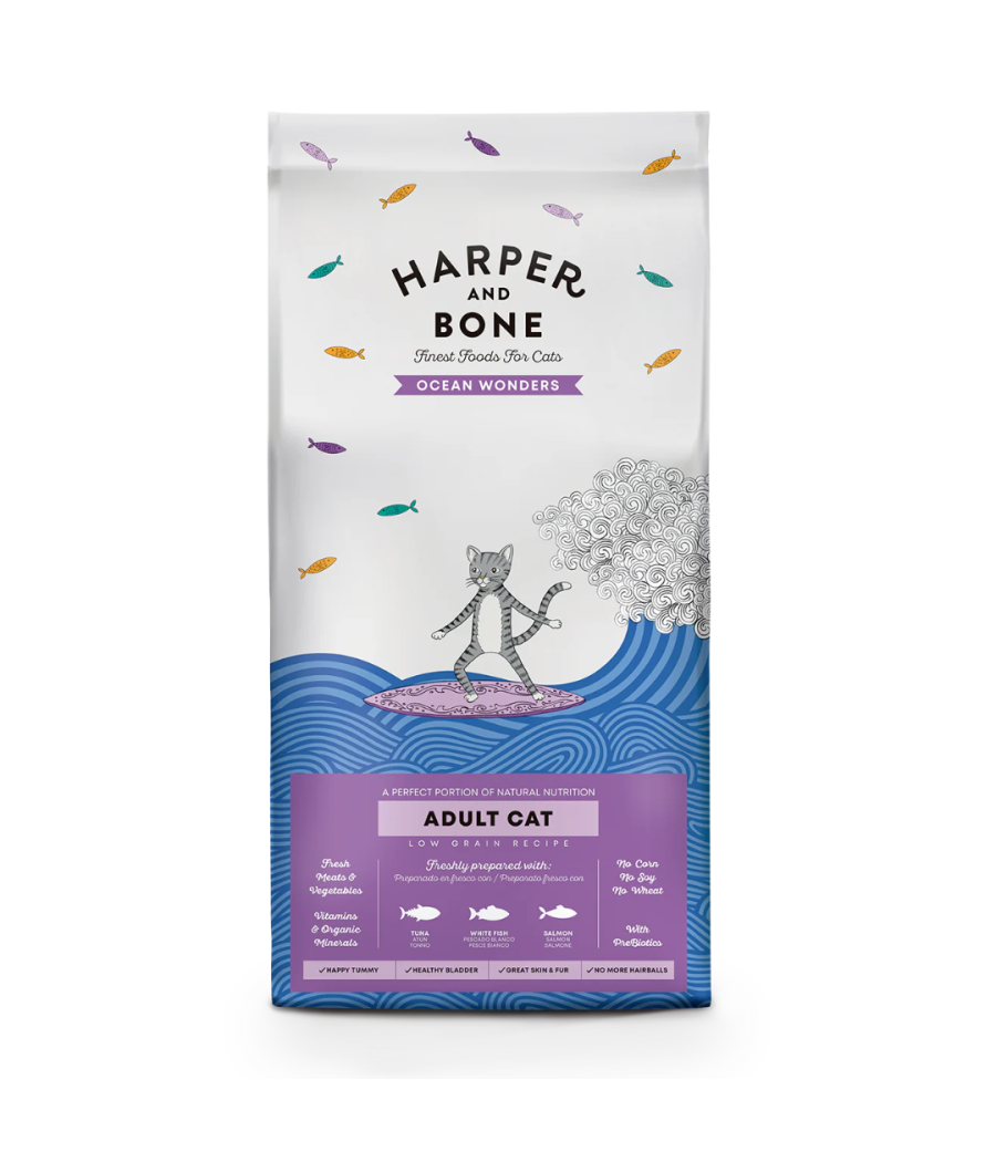 A Harper & Bone Cat Adult Ocean Wonders combina o melhor sabor do mar com uma nutrição equilibrada, oferecendo ao seu gato vitalidade, saúde e bem-estar em cada refeição. 🐾🐠💙