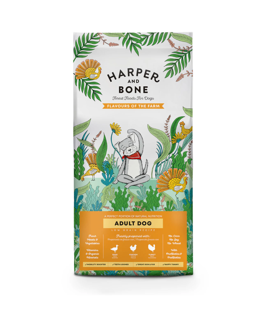 🐕 Harper & Bone Dog Adult Medium & Large ‒ Flavours of the Farm – ração low-grain para cães adultos de porte médio e grande, com carnes de galinha, peru e pato + superalimentos, glucosamina/condroitina, probióticos e suporte ósseo. 🦴🌿