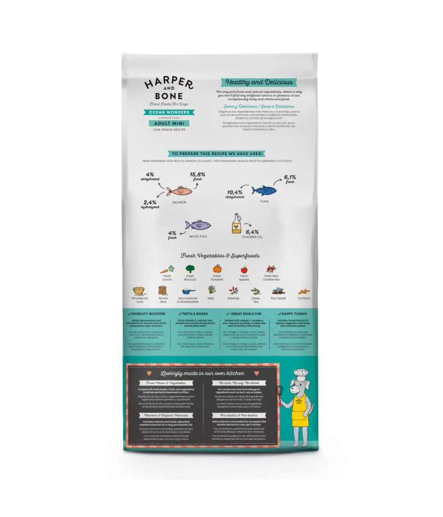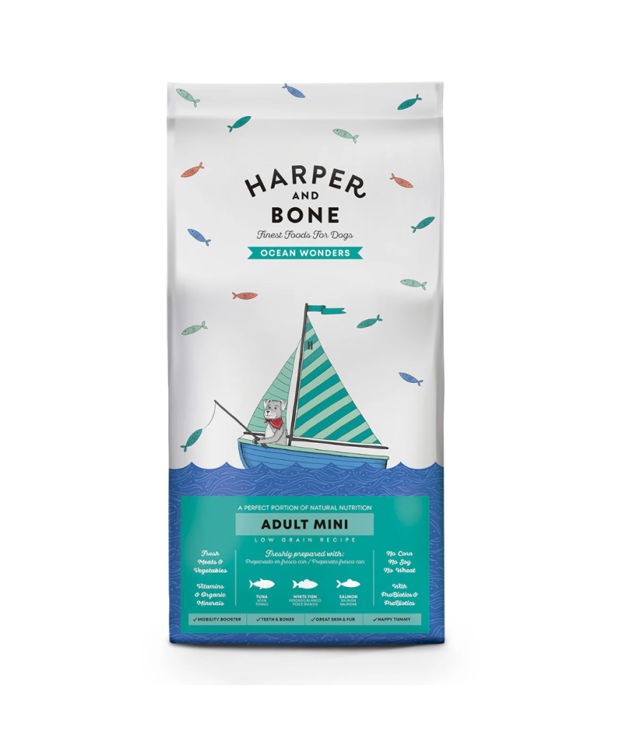 🐟 Harper & Bone Dog Adult Mini Ocean Wonders – ração premium “low-grain” para cães adultos de porte pequeno. Com salmão, atum e peixe branco, probióticos, glucosamina e condroitina para articulações, pele & pêlo saudáveis.