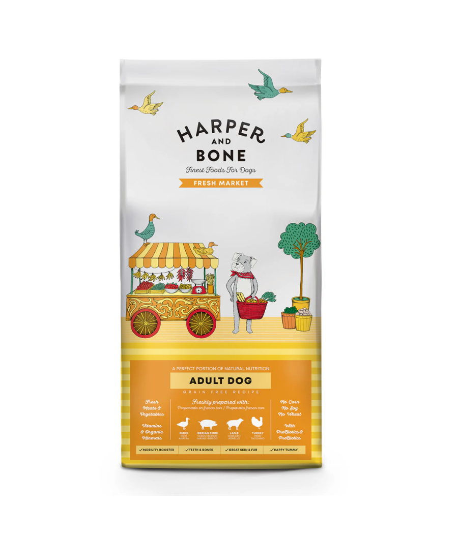 🐕 Harper & Bone Dog Adult Medium & Large Fresh Market – ração grain-free para cães adultos de porte médio/grande. Sabor com pato, peru, cordeiro e porco ibérico + probióticos, glucosamina e condroitina para articulações fortes, vitamina D, cálcio & fósforo para ossos saudáveis, pele e pelo cuidados. 🌿✨