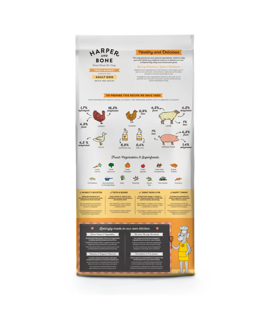A Harper & Bone Dog Adult Medium & Large Fresh Market é uma ração seca completa grain-free (sem cereais como trigo, milho ou soja) formulada para cães adultos de porte médio a grande. A receita combina várias fontes de proteína animal de alta qualidade, frutas e vegetais frescos, superalimentos, aditivos funcionais como glucosamina e condroitina, além de probióticos, para promover uma saúde global ótima.