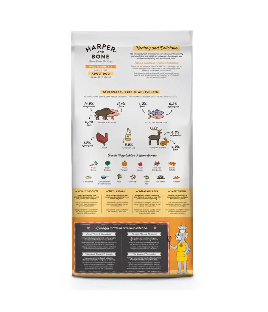 A Harper & Bone Dog Adult Wild Mountain é uma ração seca completa formulada para cães adultos de raças médias e grandes, projetada para oferecer uma nutrição natural, saborosa e equilibrada. É grain-free (sem cereais como trigo, milho ou soja), usando hidratos de carbono de batata, batata doce, grãodebico e ervilhas. Inclui proteínas de alta qualidade, ingredientes funcionais e superalimentos para suporte global do organismo.