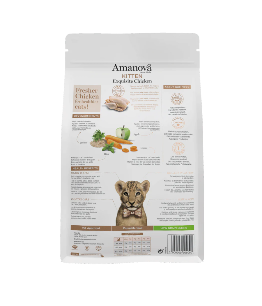 A Amanova Kitten Exquisite Chicken é uma ração seca formulada para gatinhos a partir dos 2 meses de idade, desenvolvida por veterinários com uma receita natural e hipoalergénica. Utiliza frango fresco como única fonte de proteína animal, evitando farinhas de carne ou carnes desidratadas, oferecendo assim facilidade de digestão e menor risco de reações alérgicas.