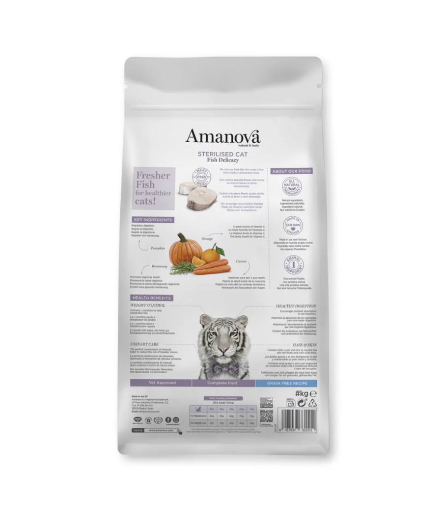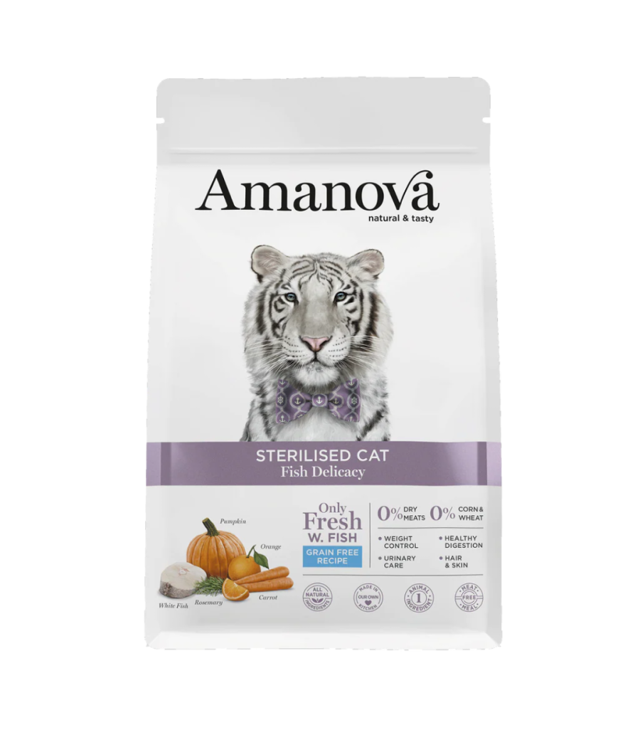 A Amanova Adult Cat Sterilised Fish Delicacy é uma ração seca grain-free (sem cereais como trigo, milho ou soja) especialmente formulada para gatos adultos esterilizados. A fórmula foi desenvolvida por veterinários e destaca-se por: usar peixe branco fresco como única fonte proteica animal, incluir L-carnitina, fibras específicas, prebióticos/probióticos, e ingredientes naturais que favorecem pele, pelagem, digestão e saúde urinária.
