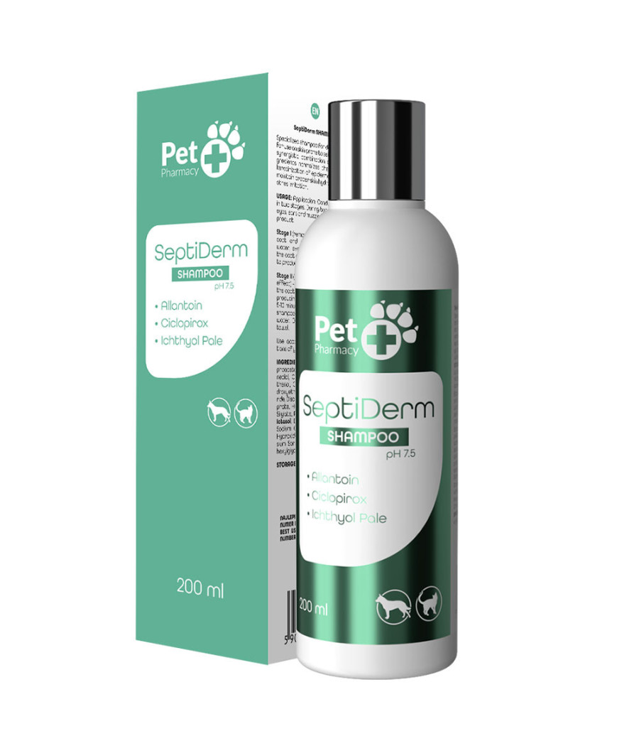 A fórmula do SeptiDerm integra ingredientes activos direcionados para: controlar a produção de sebo, reduzir as escamas e crustas, normalizar a queratinização epidérmica, acalmar irritação, e ajudar na manutenção de uma pelagem mais saudável.