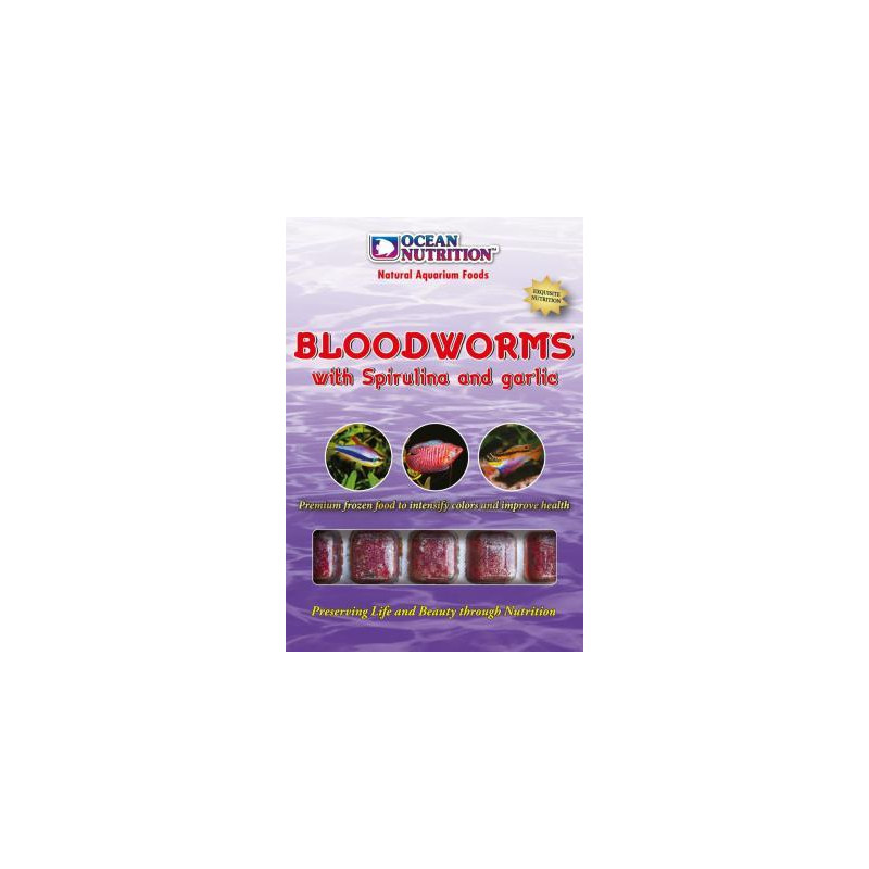Ocean Nutrition Bloodworms com Spirulina e Alho 100g (Congelado): Mistura premium de larvas de mosquito enriquecidas com spirulina e alho, promovendo crescimento saudável, imunidade reforçada e coloração vibrante para peixes tropicais de água doce e salgada.