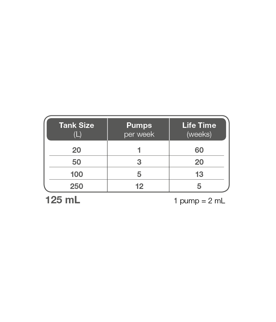 Recomendamos 6 mL (3 bombas) por 50 L de água semanalmente.
