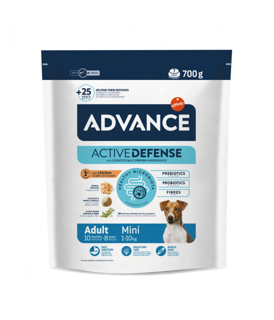 Advance Adult Mini é um alimento seco adequado a cães adultos de porte pequeno, ou seja, que pesem entre 1 e 10 kg e que tenham entre 8 meses e 8 anos. Uma ração seca, completa e equilibrada, que ajuda a reforçar as defesas e barreiras naturais do cão, graças a imunoglobulinas ativas e a polifenóis naturais. Os croquetes da ração são de tamanho reduzido, especialmente concebidos para os cães de porte mini, para que a mastigação e deglutição sejam adequadas.