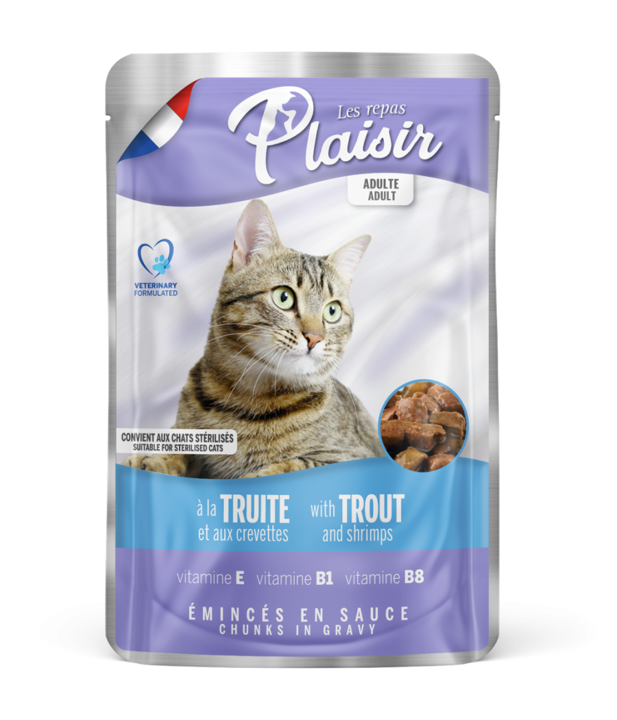 Os Pedaços com Truta e Camarão ao Molho são uma porção de refeição perfeita que pode oferecer-lhe todos os dias e até 3 vezes ao dia, para um gato castrado de 5kg, por exemplo.