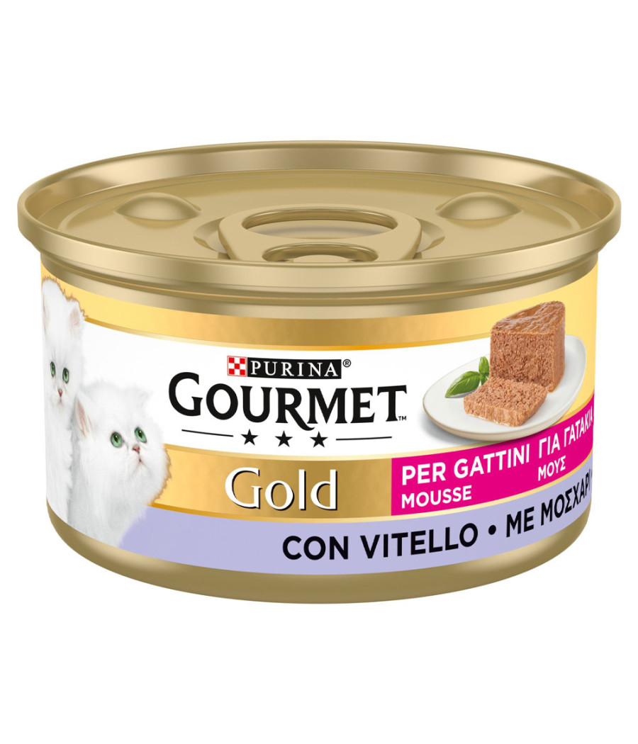 Gourmet Gold Mousse é um alimento húmido para gatinhos, com vitela, cuidadosamente preparado para proporcionar uma refeição deliciosa e nutritiva. Esta receita, de suave textura e agradável sabor, contém vitaminas e minerais essenciais para o crescimento do gatinho.
