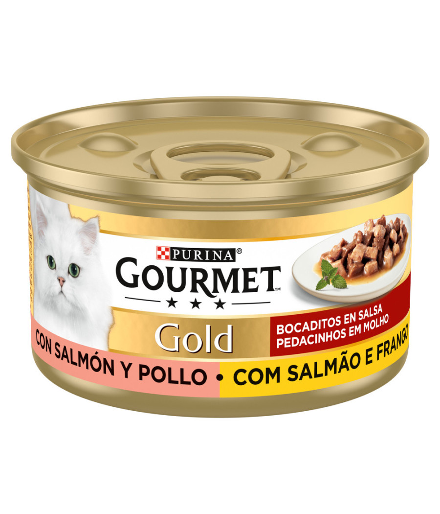 Gourmet Gold Pedacinhos em Molho é um alimento húmido, para gato adulto, com pedacinhos de salmão e frango cozinhados num delicioso molho.