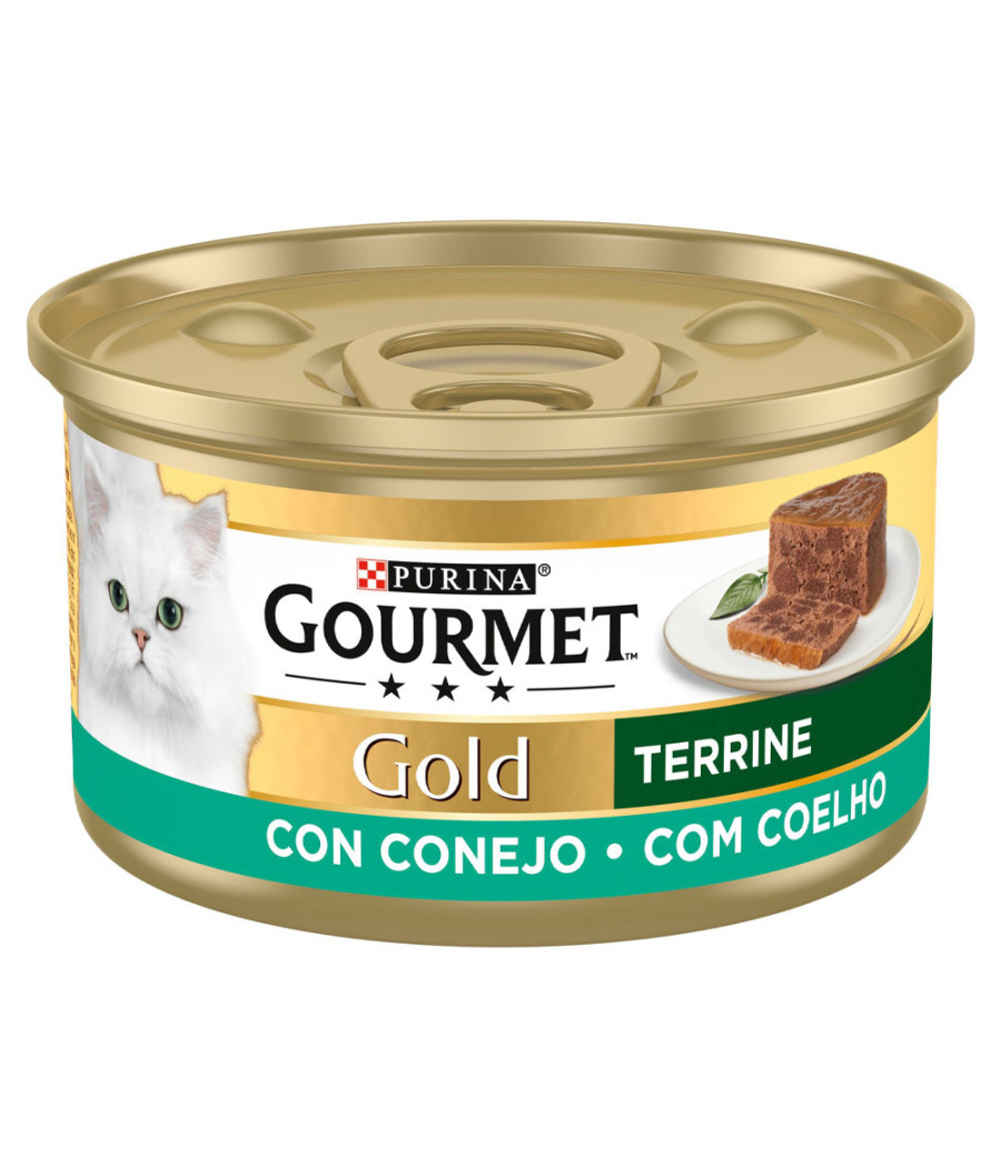 Gourmet Gold Terrine é uma gama de alimentos húmidos para gato, confecionados com ingredientes de elevada qualidade. Proporciona uma refeição de coelho, com delicados pedaços, cuidadosamente cortados e combinados com uma ligeira e apetitosa textura.
