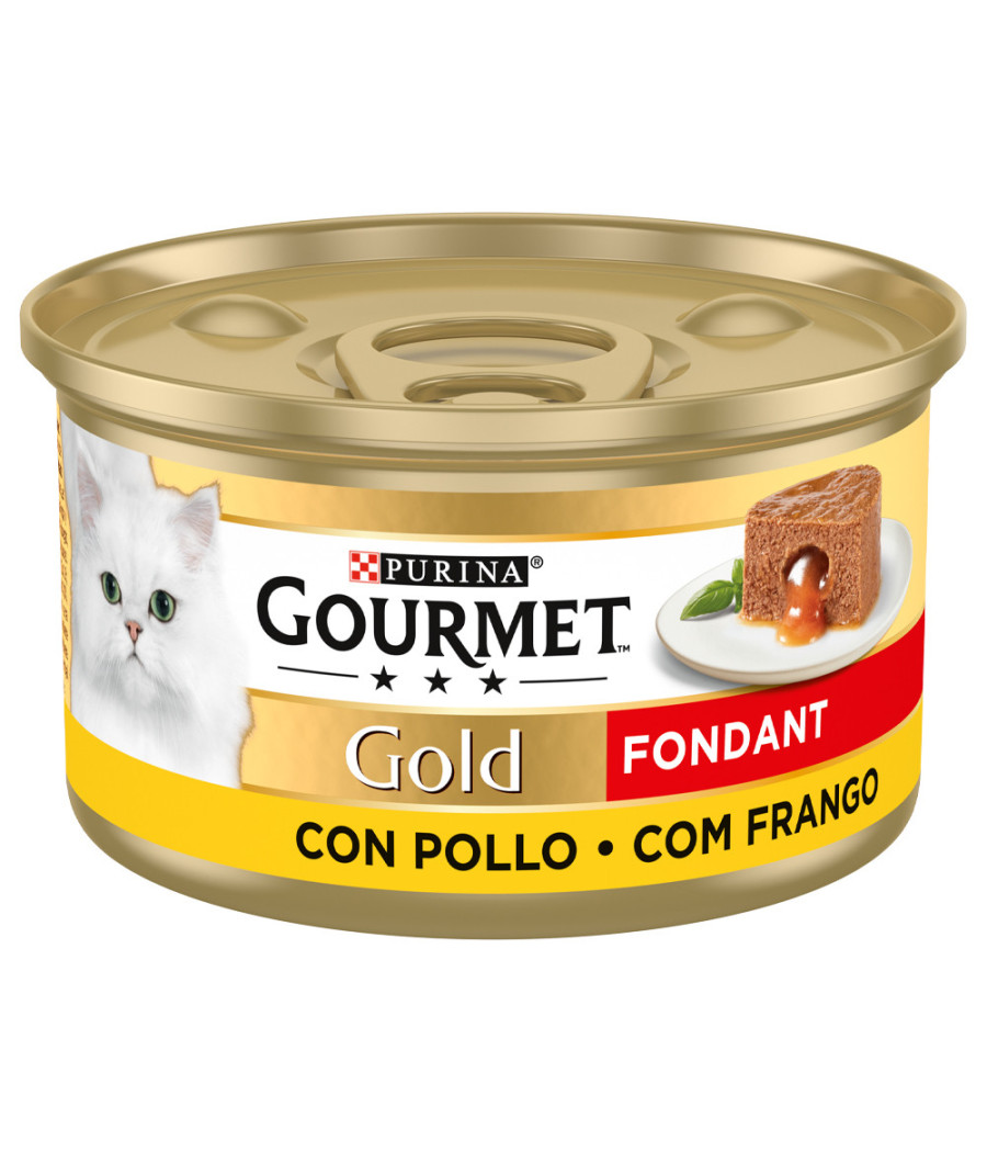 GOURMET Gold Fondant é uma mousse suave e irresistível de requintados sabores, com um surpreendente recheio derretido no interior. O seu gato começará por experimentar uma suave e delicada mousse e depois irá descobrir um inesperado recheio, com um molho suculento que o irá deliciar.