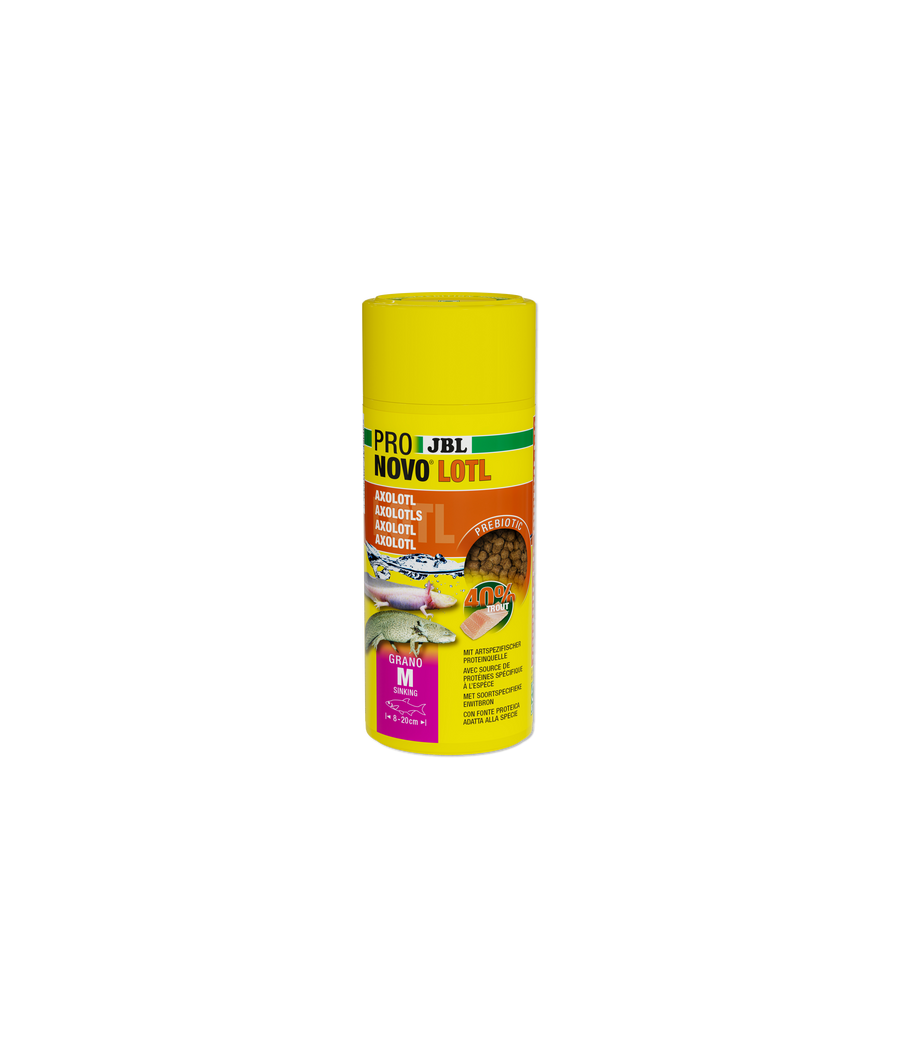 Os axolotes encontram o seu alimento através do olfato, ou seja, pelo cheiro, e com a ajuda de mecanorrecetores, que detetam estímulos da corrente e vibrações, tal como a linha lateral dos peixes. Assim, o alimento vivo e o alimento com um cheiro “interessante”, como o JBL PRONOVO LOTL, são ideais para uma alimentação adequada. Na natureza, ficam à espera da presa e comem crustáceos, larvas de inseto, pequenos peixes e até outros exemplares da própria espécie. O espetro alimentar foi tido em conta na composição do alimento JBL PRONOVO LOTL e, por isso, este inclui, entre outros, carne de peixe (truta), camarões e Gammarus.