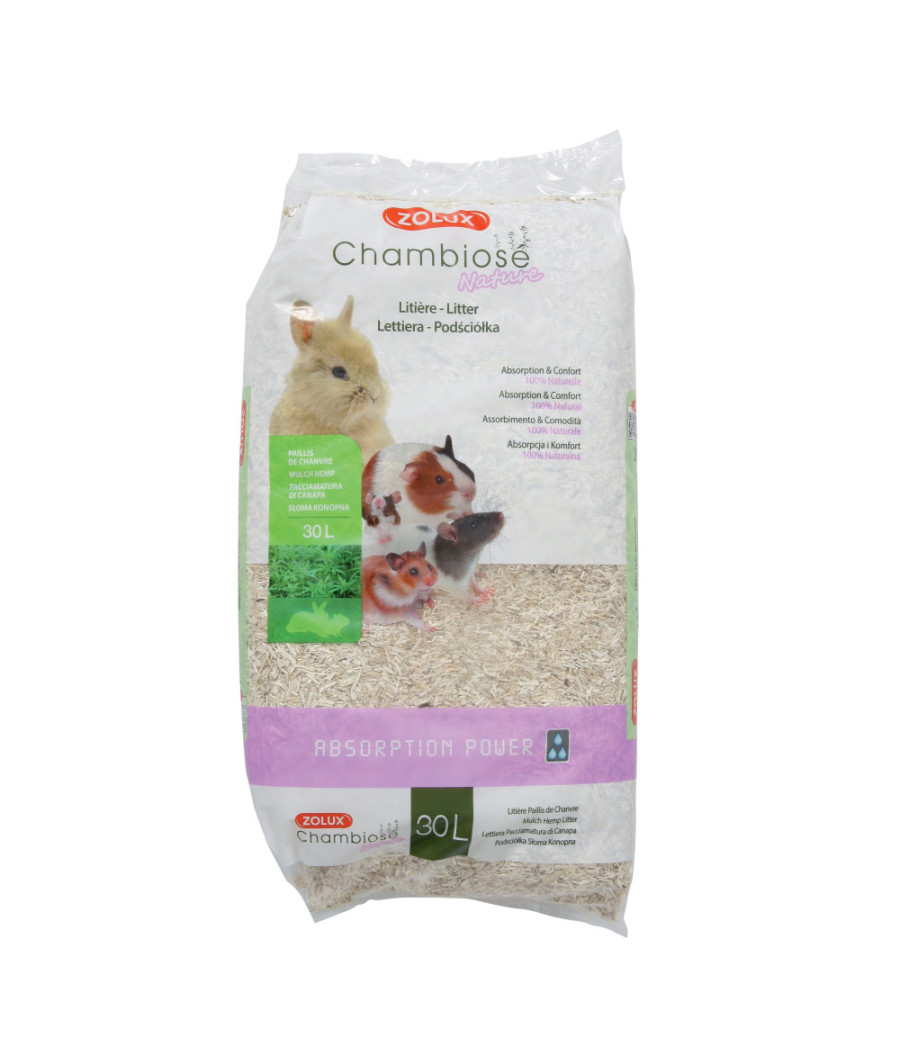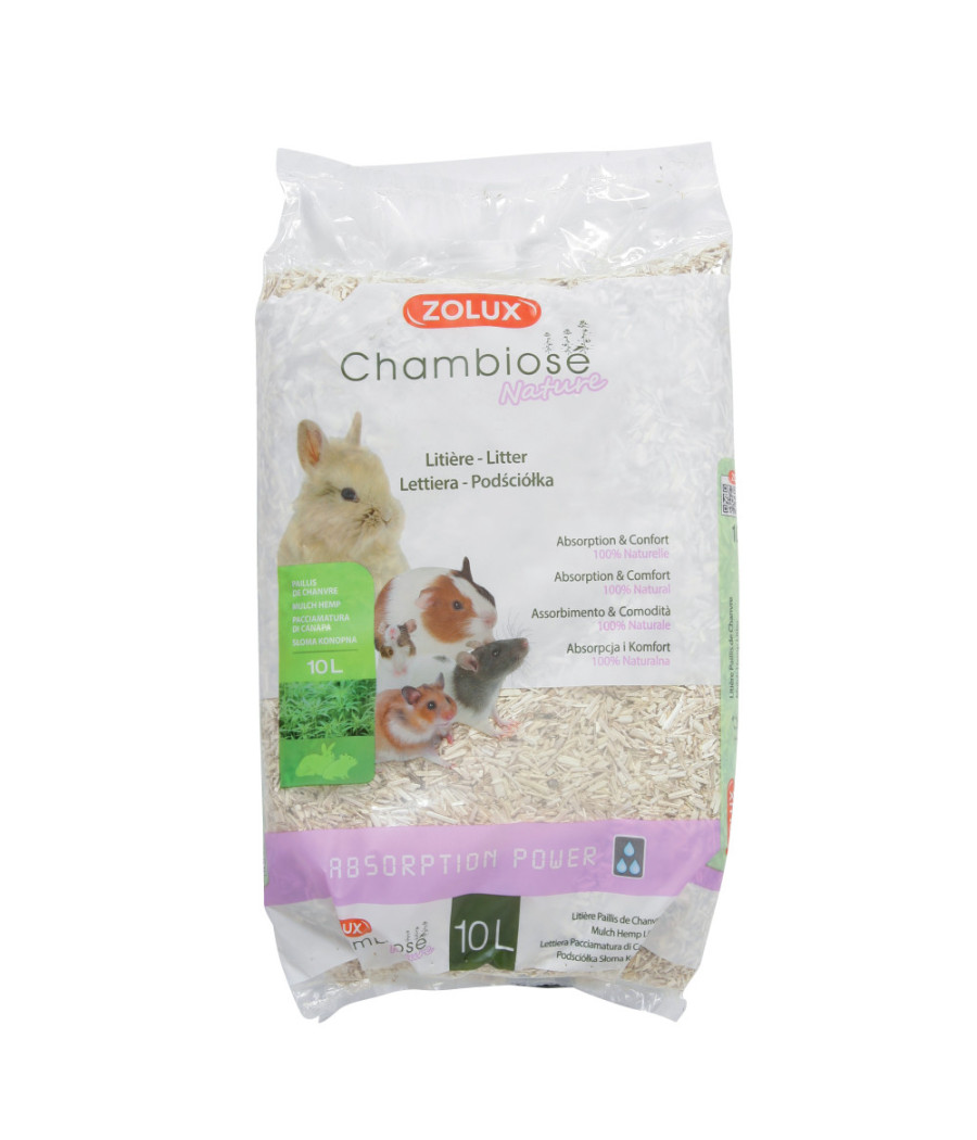 O Substrato natural de cânhamo ultra absorvente Chambiose Zolux tem uma vida mais longa e uma frequência de substituição mais baixa. Além disso, sua composição natural é uma barreira eficaz contra os maus odores.