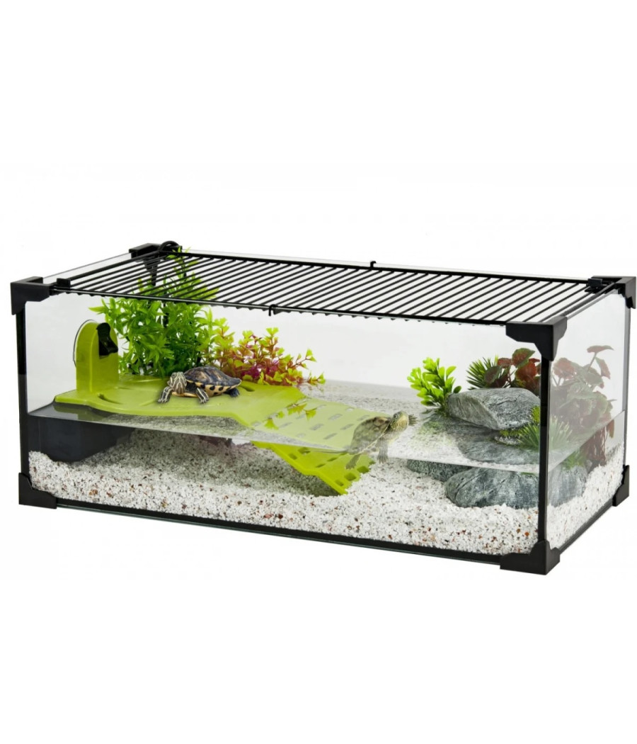 - Aquaterrário para tartaruga de água com uma grelha com sistema de bloqueio: posicionada no topo do terrário, a grelha é uma segurança tanto para o risco de fuga como para intrusões externas (gatos, crianças ...) ou queda de objectos.