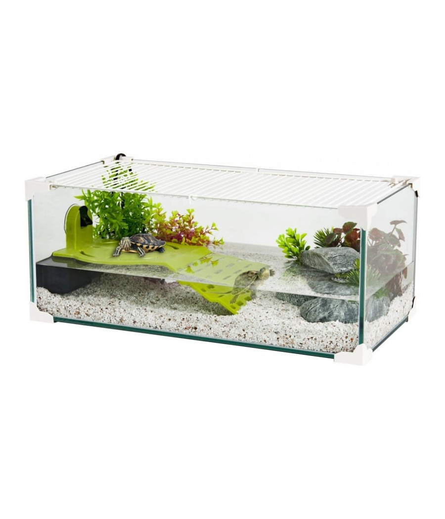 - Aquaterrário para tartaruga de água com uma grelha com sistema de bloqueio: posicionada no topo do terrário, a grelha é uma segurança tanto para o risco de fuga como para intrusões externas (gatos, crianças ...) ou queda de objectos.