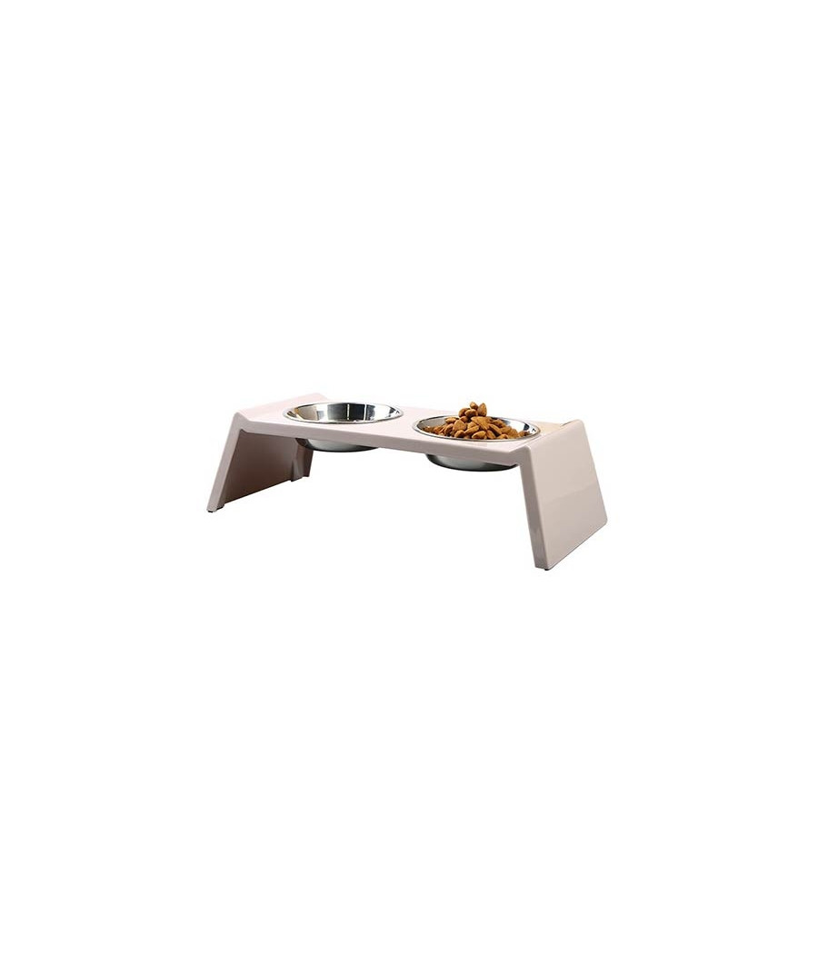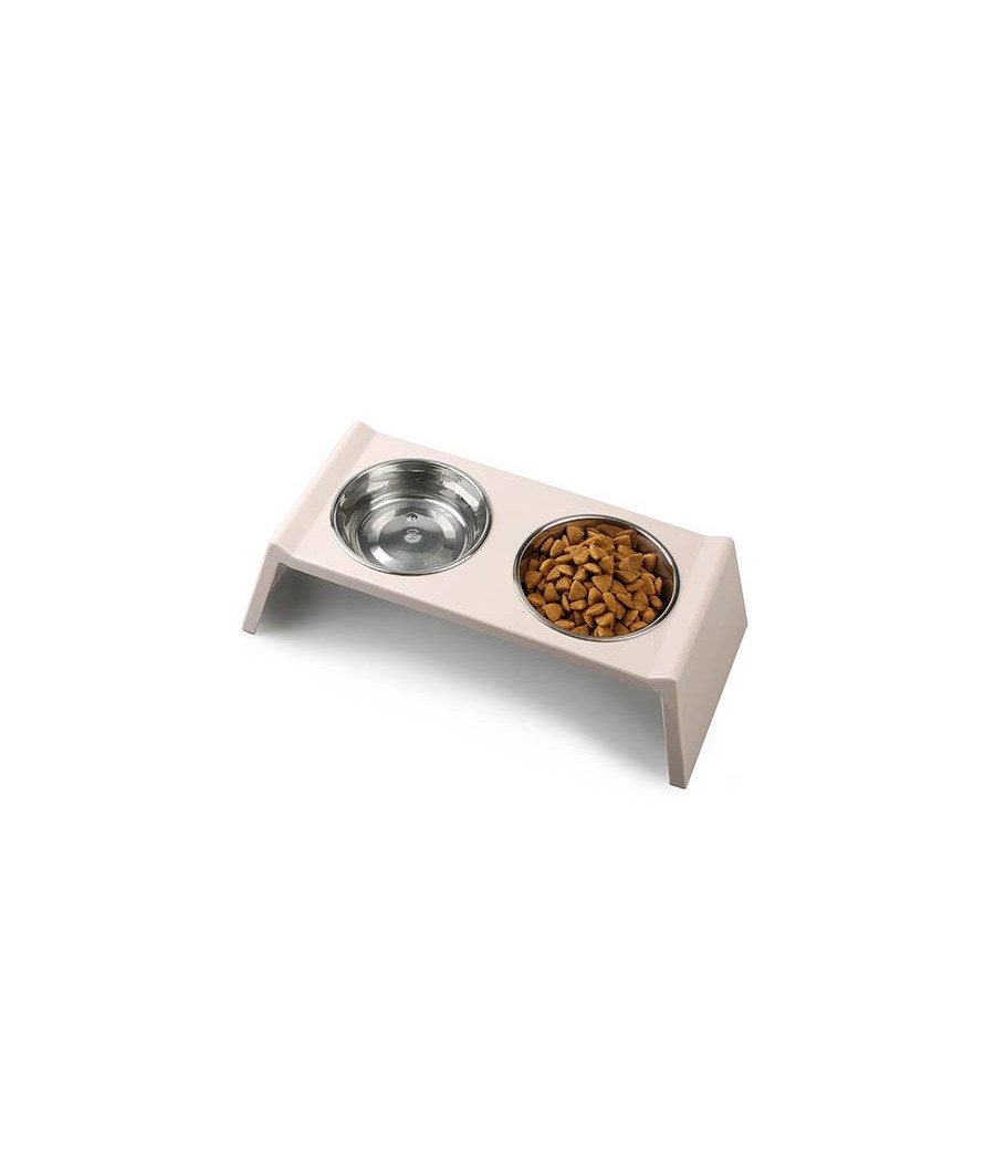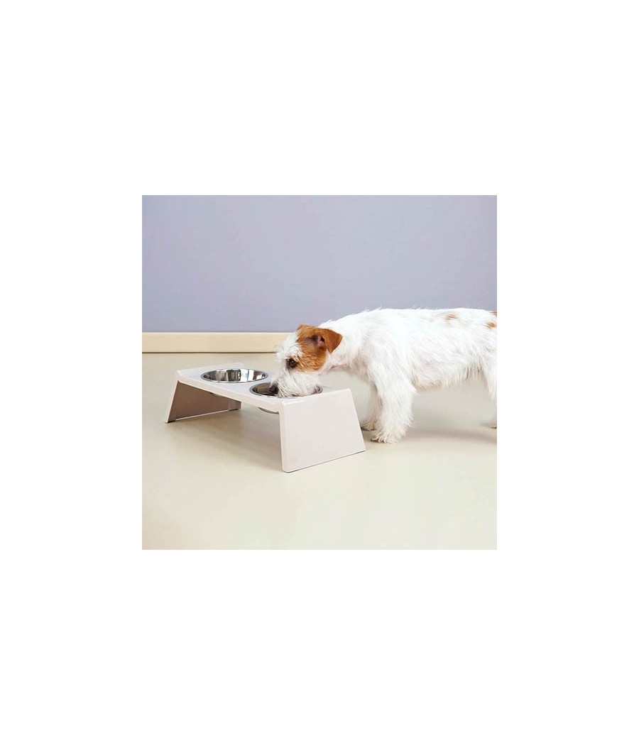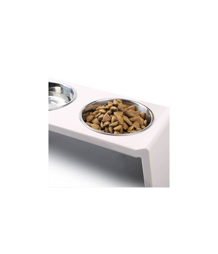 O comedouro tem base em melamina bege, que se integra perfeitamente em qualquer estilo de decoração de casa. Os recipientes para alimentos e água são fabricados em aço inoxidável, material altamente higiênico e fácil de limpar.