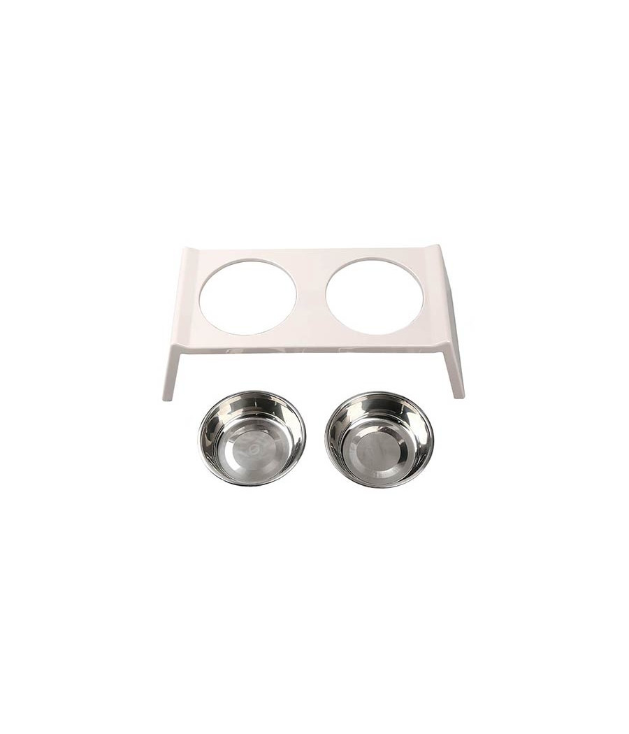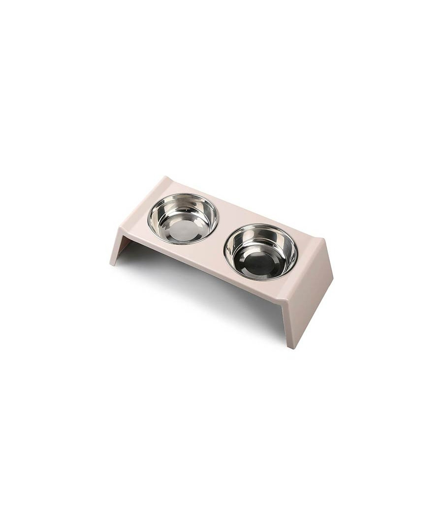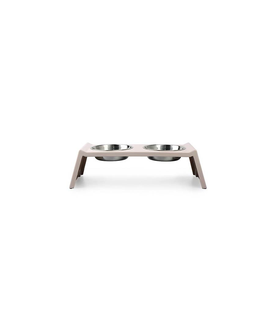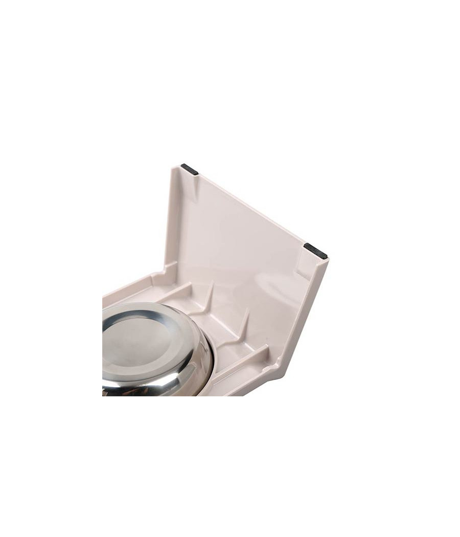O comedouro tem base em melamina bege, que se integra perfeitamente em qualquer estilo de decoração de casa. Os recipientes para alimentos e água são fabricados em aço inoxidável, material altamente higiênico e fácil de limpar.