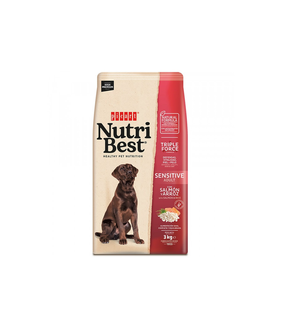 Nutribest High Premium Adulto Sensitive é um alimento completo com salmão e arroz, para cães adultos de porte médio e grande.