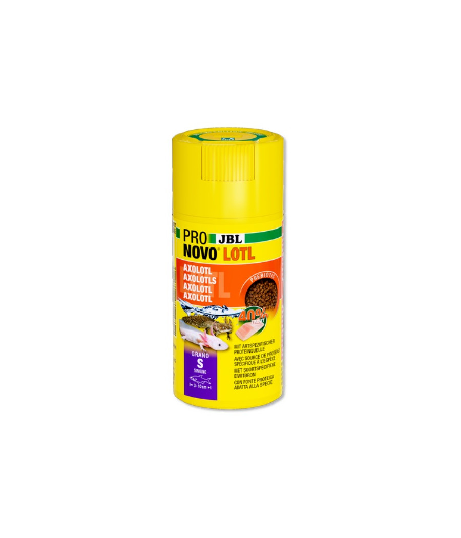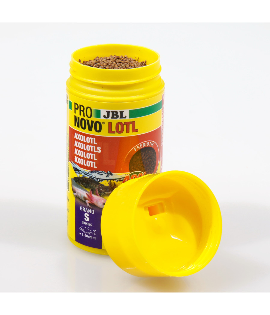Os axolotes encontram o seu alimento através do olfato, ou seja, pelo cheiro, e com a ajuda de mecanorrecetores, que detetam estímulos da corrente e vibrações, tal como a linha lateral dos peixes. Assim, o alimento vivo e o alimento com um cheiro “interessante”, como o JBL PRONOVO LOTL, são ideais para uma alimentação adequada. Na natureza, ficam à espera da presa e comem crustáceos, larvas de inseto, pequenos peixes e até outros exemplares da própria espécie. O espetro alimentar foi tido em conta na composição do alimento JBL PRONOVO LOTL e, por isso, este inclui, entre outros, carne de peixe (truta), camarões e Gammarus.