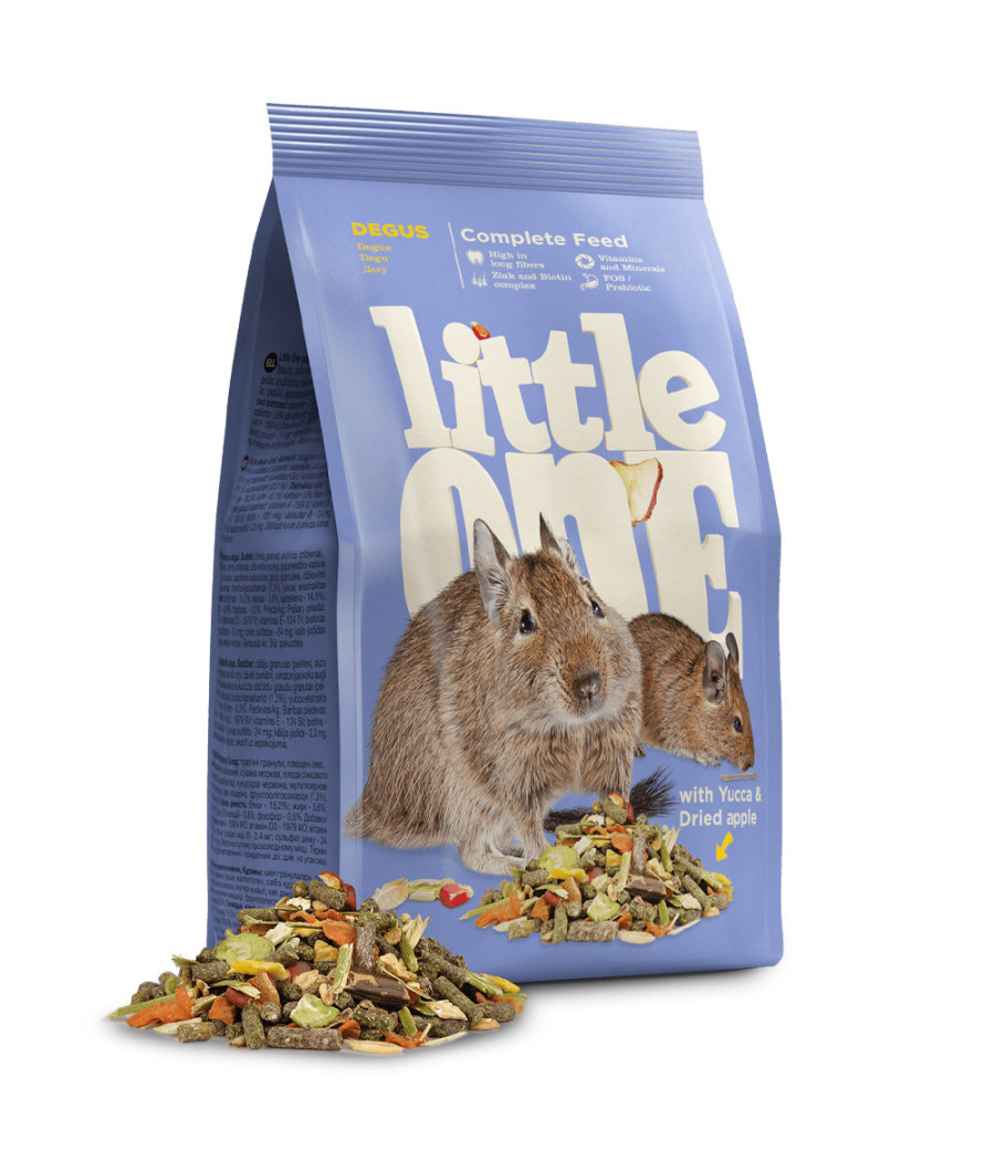 O alimento Liltte One para degus contém proteínas, gorduras, hidratos de carbono, vitaminas e minerais essenciais para o bem-estar e boa saúde geral dos animais de estimação. Uma dieta equilibrada, com alto valor nutricional e de elevada digestibilidade.