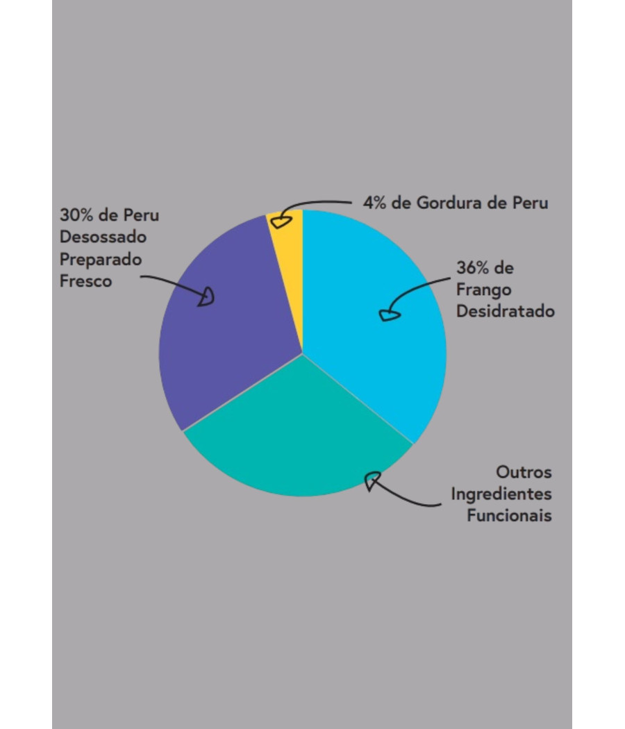 70% de Peru e Frango (incluindo 36% de Frango Desidratado, 30% de Peru Desossado Preparado Fresco, 4% de Gordura de Peru), Batata, Ervilhas, Grão de Bico, Lentilha, Molho de Fígado Hidrolisado, Suplemento de Omega 3, Celulose, Minerais, Frutooligossacarídeos (FOS, 480 mg / kg), Mannanoligossacarídeos (MOS, 120 mg / kg), Mirtilos Desidratados, Extrato de Mandioca (180 mg/kg)