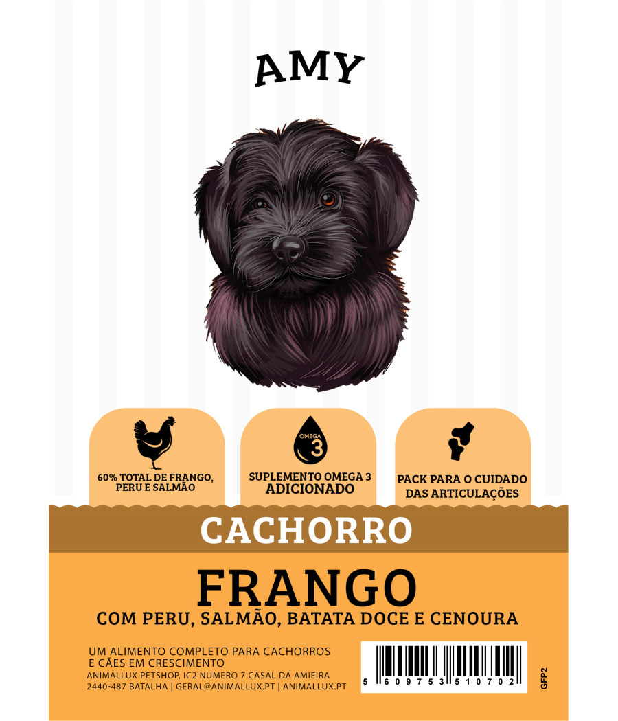Frango, Peru e Salmão 60% (incluindo Frango Preparado fresco 20%, Frango Desidratado 14%, Peru Preparado Fresco 7%, Salmão Preparado Fresco 7%, Peru Desidratado 7%, Salmão Desidratado 3% e Caldo de Frango 2%), Batata Doce (22%), Batata, Linhaça, Suplemento de ômega 3, Polpa de Beterraba, Minerais, Cenoura (0,2%), Ervilhas (0,07%), Glucosamina (170 mg / kg), Metilsulfonilmetano (170 mg / kg), Sulfato de Condroitina (125 mg / kg), Nucleotídeos, Frutooligossacarídeos (FOS, 96 mg / kg), Mannanoligossacarídeos (MOS, 24 mg / kg)