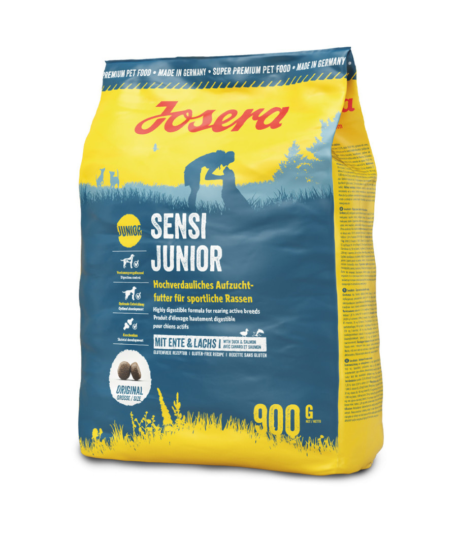 Josera SensiJunior é um alimento seco sem glúten, adequada a cães atléticos em fase de crescimento.