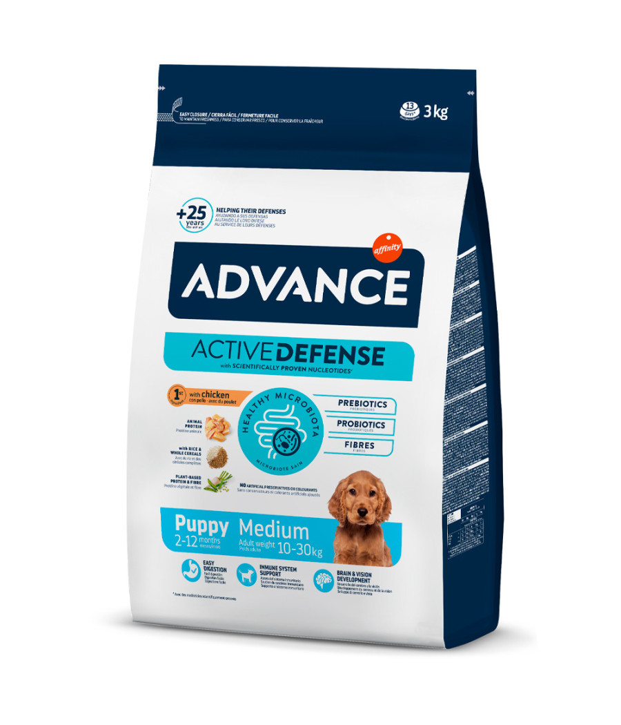 Advance Puppy Medium é uma ração que satisfaz as necessidades nutricionais dos cachorros de raça média - aqueles que, quando adultos, pensam entre 10kg e 30kg. Promove a saúde dos sistemas digestivo e imunológicos, reforça as defesas do cachorro e contribui para o adequado crescimento dos ossos.