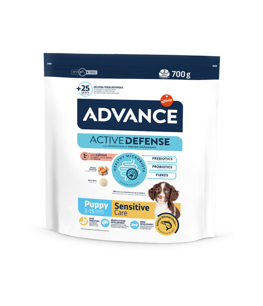 Advance Puppy Sensitive é um alimento completo para cães com sensibilidades digestivas. Adequada entre os dois e os 12 meses de idade, contém uma fórmula monoproteica, com salmão, como única fonte de proteína animal, e arroz.