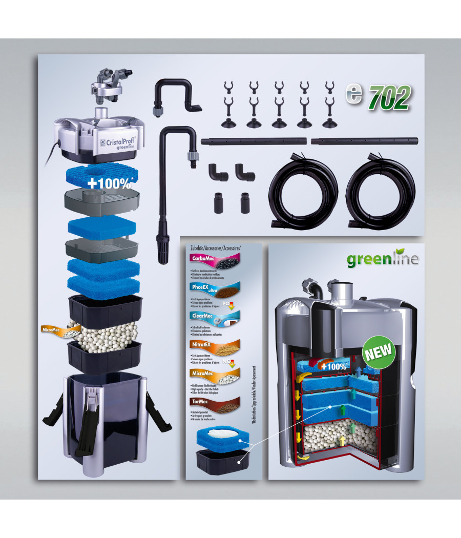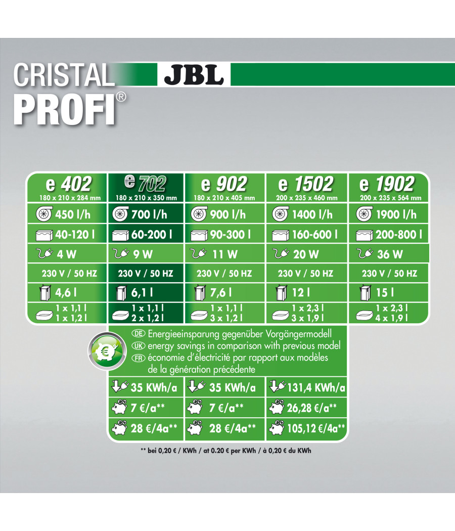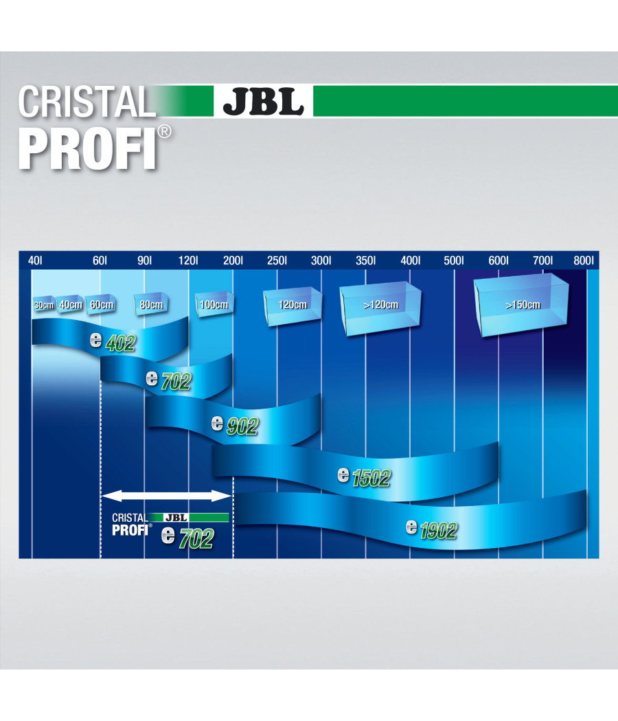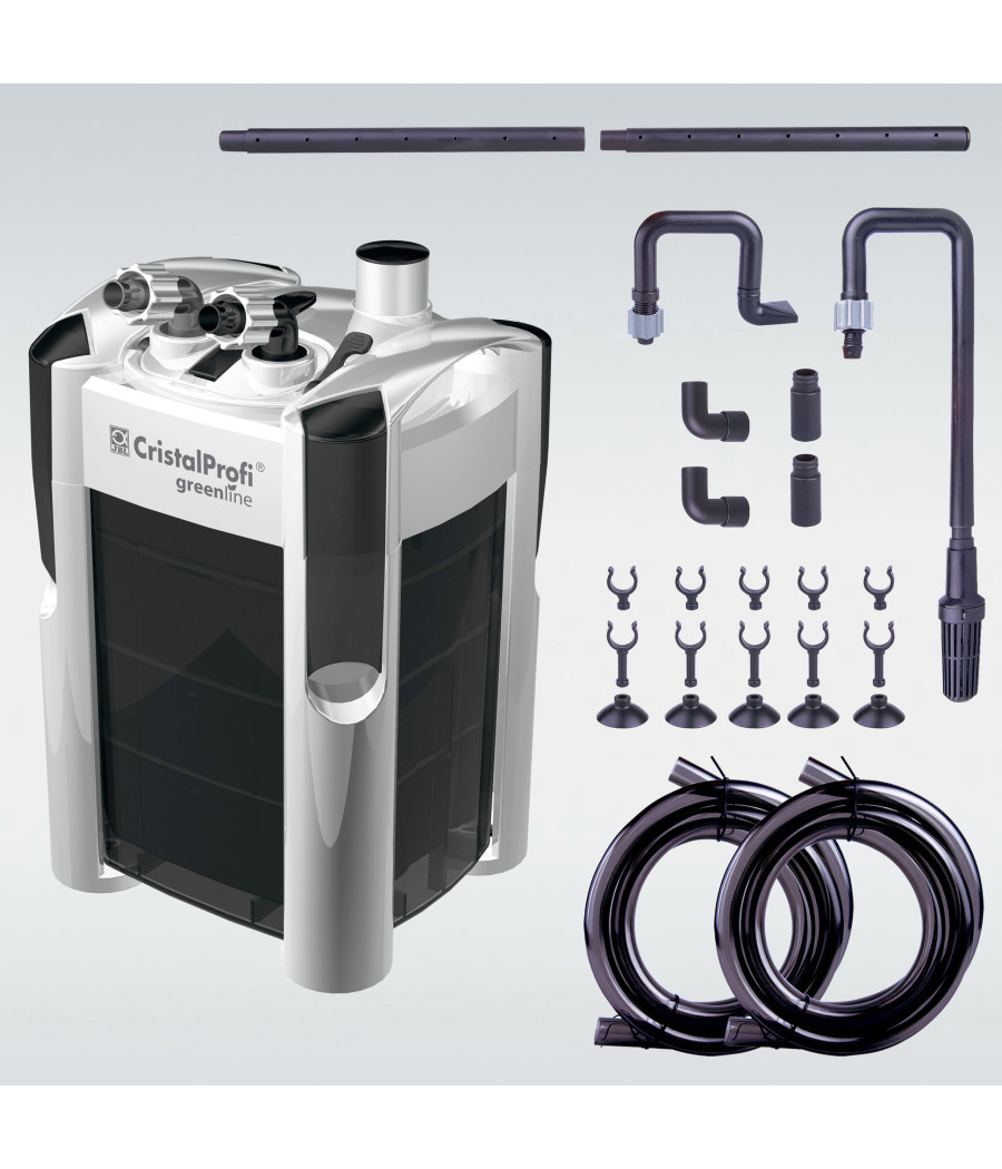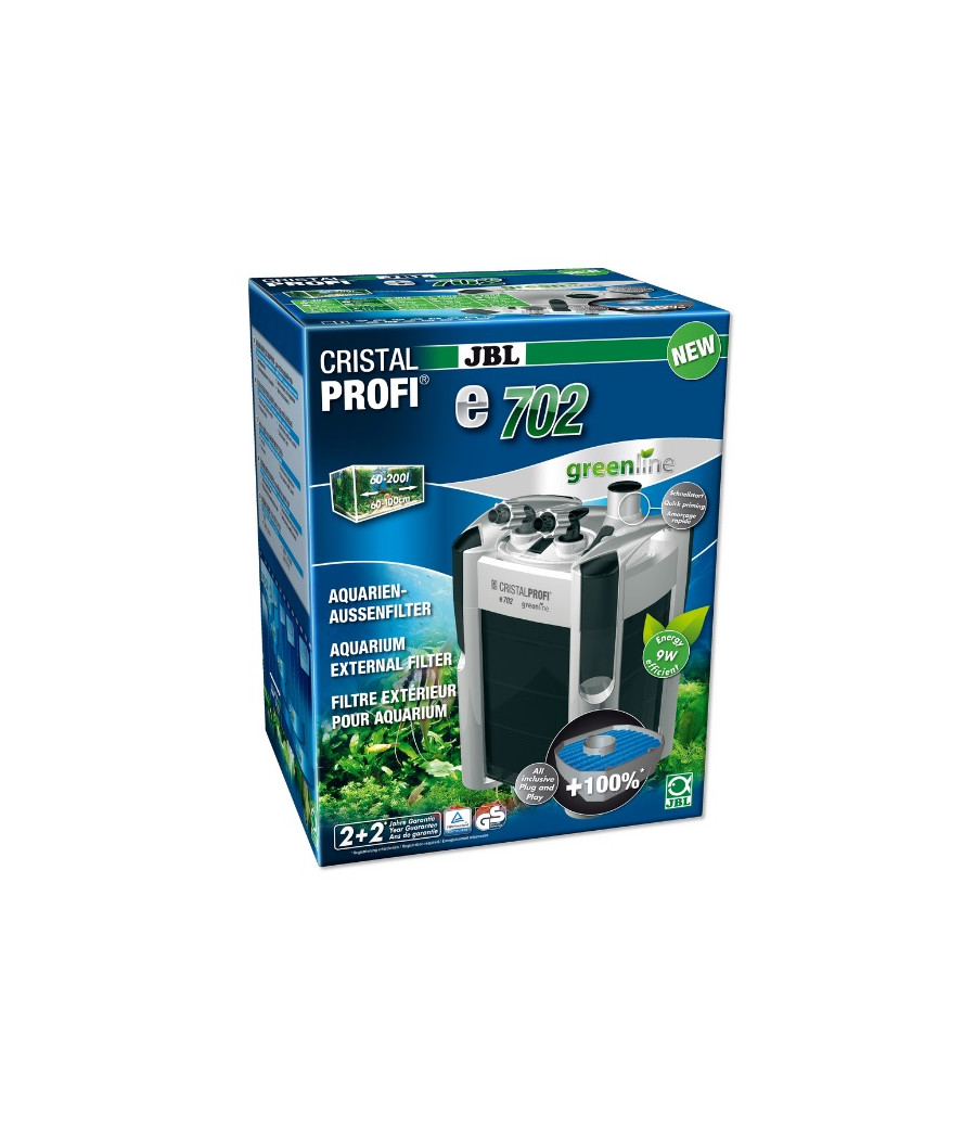 A novidade face ao modelo JBL CristalProfi e 701 é que o cesto superior do filtro foi concebido completamente de novo e de forma mais eficiente: em vez de esteiras pré-filtrantes mais pequenas, situadas no exterior, no cesto do filtro, existe agora uma esteira com o dobro do tamanho, contínua como pré-filtro. Deste modo o filtro não entope tão facilmente, mesmo com uma forte sujidade e os pré-filtros não precisam de ser limpos com tanta frequência.