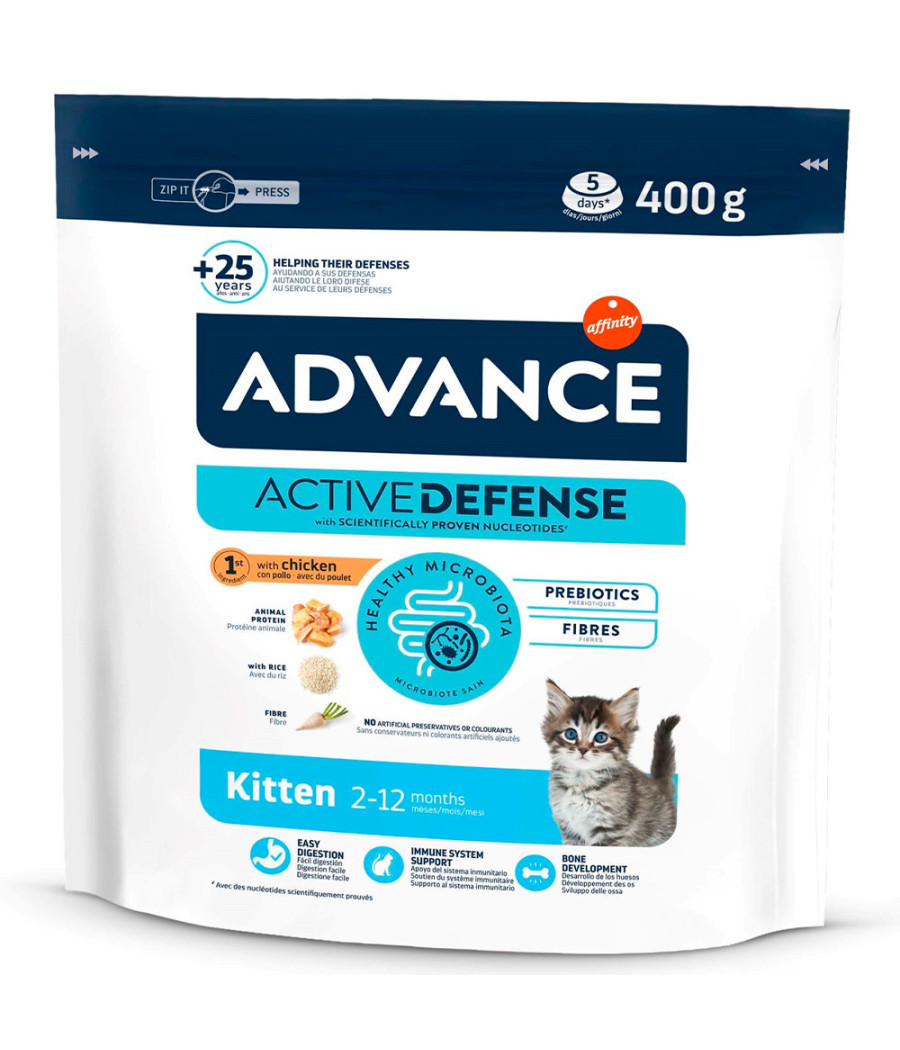 Advance Kitten é um alimento equilibrado, para gatinhos (dos 2 aos 12 meses) ou gatas gestantes ou lactantes. Uma ração seca que, graças aos nucleótidos, ajuda a reforçar as defesas e barreiras naturais do gato.