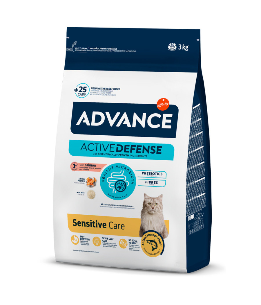 Advance Sensitive é um alimento completo e equilibrado especialmente indicado para gatos adultos com sensibilidade digestiva. Ajuda a reforçar as defesas e barreiras naturais do gato, graças aos polifenóis naturais e ao alto teor proteico. Uma ração formulada com salmão e arroz, fonte de proteínas e hidratos de carbono, que facilitam a digestão. A inulina e as imunoglobulinas contribuem para uma digestão saudável e saúde intestinal.