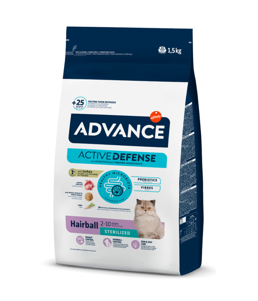 Advance Hairball Sterilized Adult é um alimento completo e equilibrado especialmente indicado para gatos adultos esterilizados com problemas de bolas de pelo. Ajuda a reforçar as defesas e barreiras naturais do gato, graças aos polifenóis naturais e ao alto teor proteico. Uma ração formulada com peru, cevada e imunoglobulinas, que contribuem para uma digestão saudável e boa saúde intestinal.