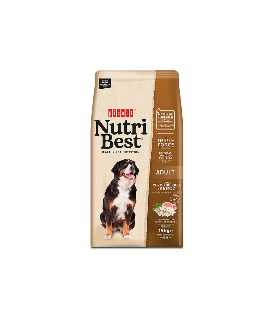 Nutribest High Premium Adulto Porco Ibérico e Arroz é um alimento completo, para cães adultos de porte médio e grande.