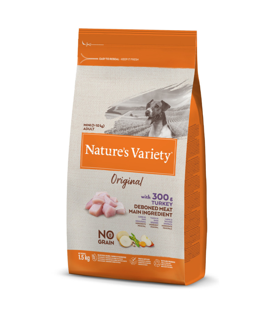 Alimento seco, elaborado com carne de peru desossada como ingrediente principal, frutas e legumes cuidadosamente selecionados, e fontes naturais de hidratos de carbono alternativos.